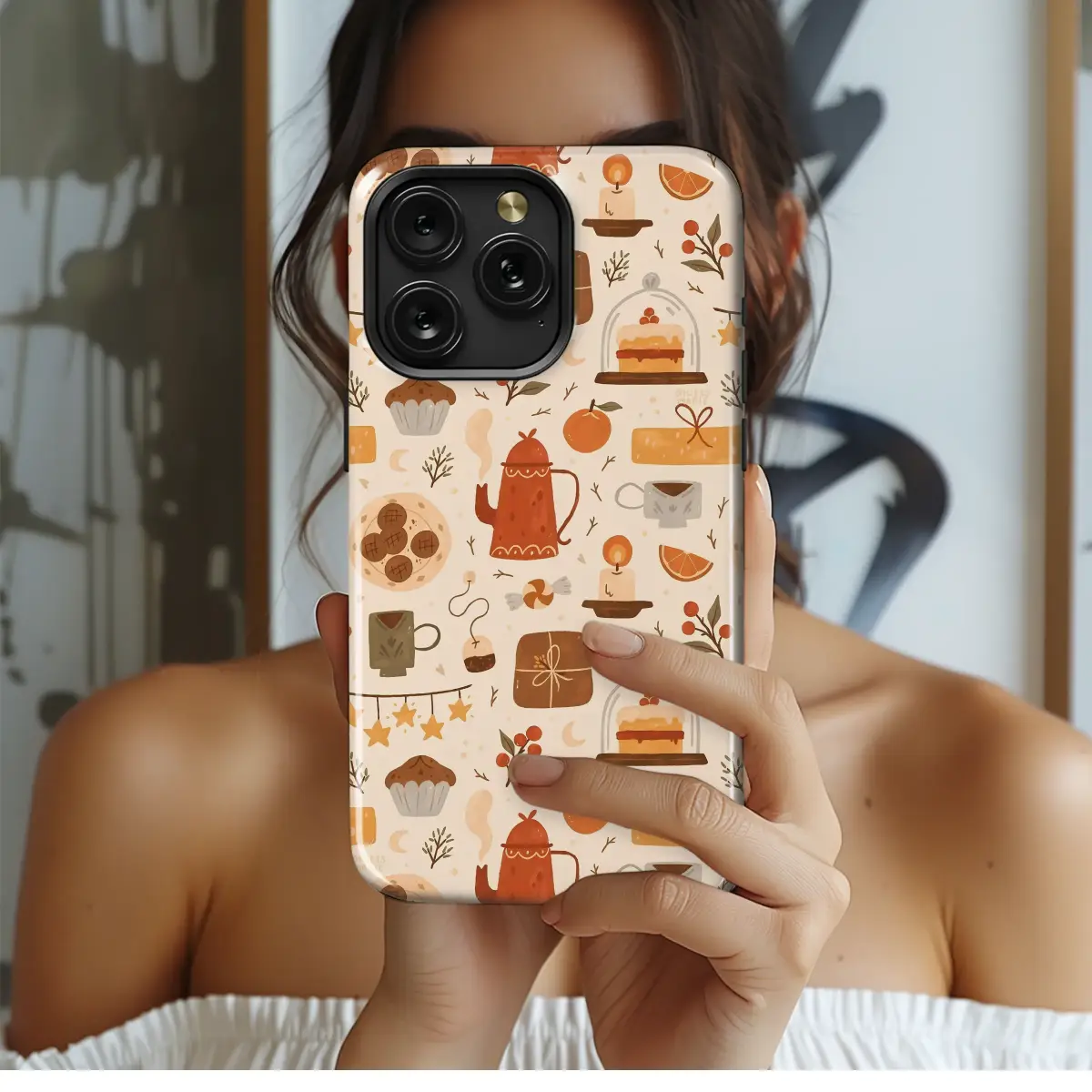 Embrace the heartwarming spirit of the season with this enchanting illustrated design, a perfect tribute to the simple, comforting joys of a cozy day. Let your imagination wander to a quiet afternoon, where the gentle steam rises from a rustic teapot, promising a warm, soothing brew. The air is filled with the sweet scent of freshly baked spiced muffins and zesty oranges, mingling with the soft, flickering glow of a single candle. This pattern is a visual feast, capturing that blissful moment of hygge by weaving together delightful elements: a delicate layer cake protected under a glass cloche, a string of twinkling golden stars, plates of delicious cookies, and thoughtfully wrapped presents. Every detail is rendered in a warm, earthy color palette of rustic reds, comforting browns, and soft creams, evoking a sense of handmade charm and nostalgia. It’s an invitation to slow down, to savor the quiet happiness found in a warm mug and a sweet treat. This beautiful piece is an ideal gift for the tea lover, the baker, or anyone who cherishes the cottagecore aesthetic. Let this charming artwork be a daily reminder to find beauty in comfort, celebrating those small, perfect moments that make life so magical and bright.