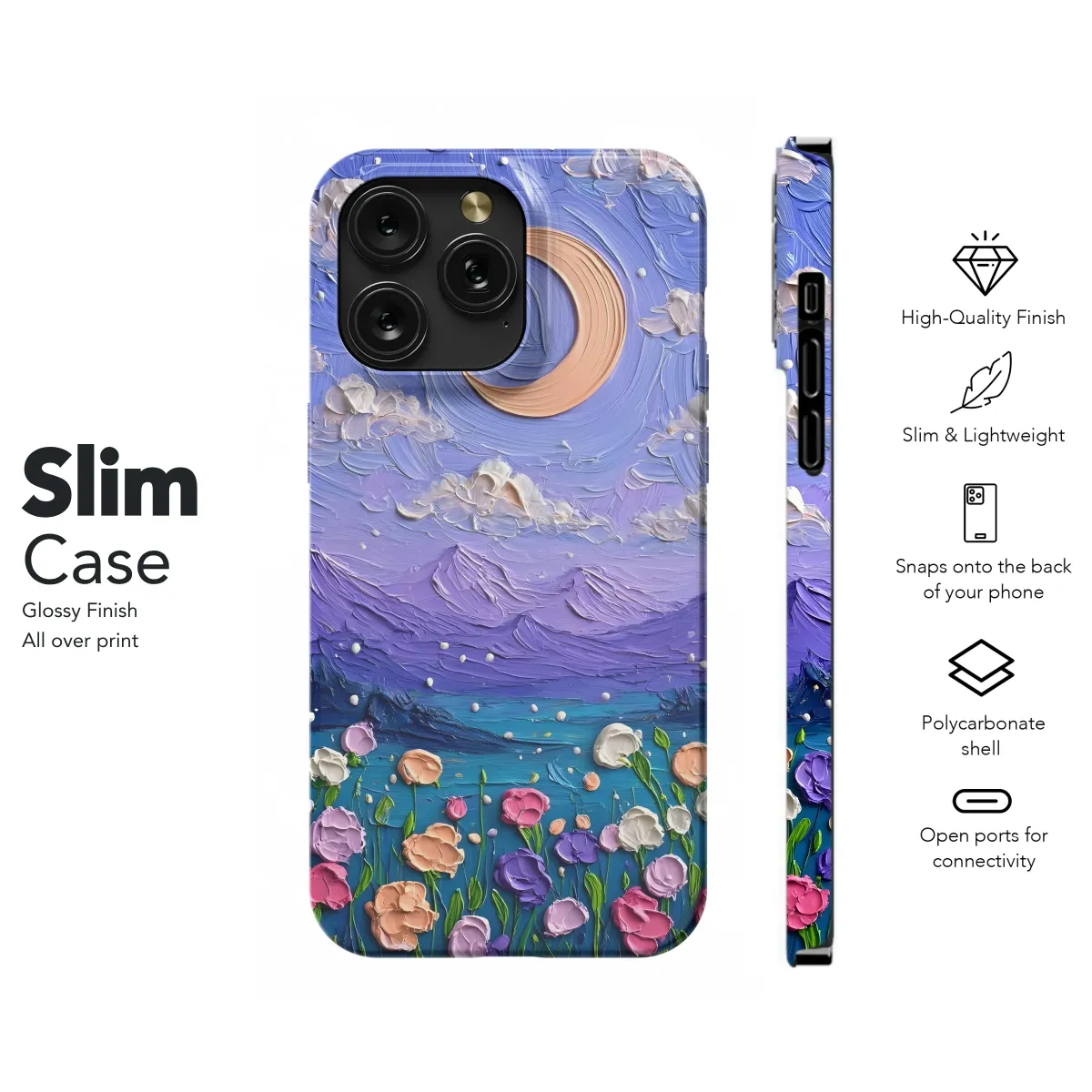 Transform your everyday essentials with this vibrant, hand-painted artwork. This design features a dreamy nightscape, a whimsical crescent moon glowing softly against a backdrop of textured purple mountains and fluffy clouds dusted with sparkling stars. A field of colorful flowers in a variety of soft hues adds a touch of whimsical charm to this enchanting scene. The thick, impasto brushstrokes create a captivating three-dimensional effect, bringing the beauty of nature to life. Perfect for adding a touch of artistic flair to your personal style, this piece is printed with high-quality inks ensuring vibrant and long-lasting colors. Each piece is unique, reflecting the handmade nature of the original artwork, guaranteeing a one-of-a-kind accessory that elevates your daily routine. This beautiful design brings joy and artistic expression to your personal style, adding a unique touch to your belongings. Showcase your individuality with this stunning, captivating piece of wearable art. Enhance your everyday look with a product that speaks to your artistic soul. This stunning design will turn heads wherever you go. Bring a bit of magic into your world.
