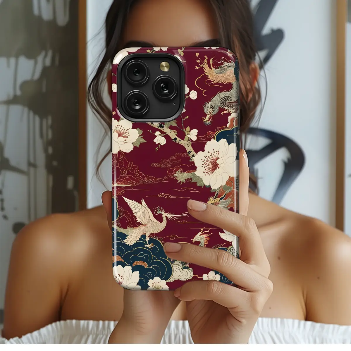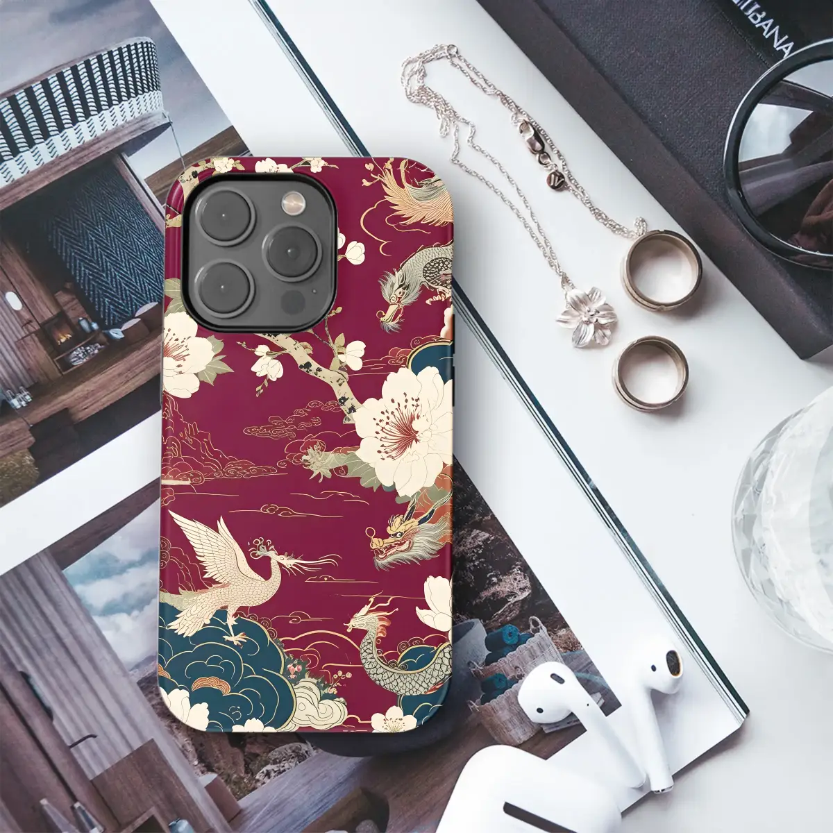 Elevate your style with this exquisite design, featuring a captivating interplay of majestic dragons and graceful phoenixes amidst a breathtaking bloom of cherry blossoms. The rich burgundy backdrop provides a luxurious contrast to the intricate gold detailing and soft ivory flowers, creating a truly opulent aesthetic. This vibrant artwork is a stunning representation of traditional Asian artistry, blending mythical creatures with delicate floral motifs for a piece that is both powerful and serene. Perfect for adding a touch of Eastern elegance to your everyday life, this design showcases meticulous detail and a sophisticated color palette. Its timeless appeal makes it a sophisticated statement piece, guaranteed to turn heads and spark conversation. This high-quality print ensures vibrant colors and lasting durability, allowing you to enjoy its beauty for years to come. Transform your accessory into a work of art with this unique and enchanting design, showcasing the beauty of mythical creatures and flourishing nature. Add a touch of magic to your personal style with this breathtaking piece.