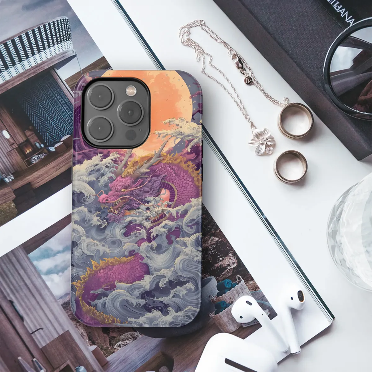 Unleash your inner mythical beast with this breathtaking design, featuring a majestic dragon amidst a tempestuous sea under a blood-orange moon. The intricate details of the dragon's scales, the swirling power of the waves, and the dramatic celestial backdrop create a captivating and powerful image. This striking artwork is a testament to the beauty of nature's raw power and the legendary grace of mythical creatures. Perfect for those who appreciate bold statements and unique, eye-catching aesthetics, this design transforms your everyday item into a work of art. Its vibrant colors and detailed artistry make it a head-turner, guaranteed to start conversations and reflect your individual style. The high-quality print ensures a long-lasting and vibrant image that will withstand daily wear and tear. Show the world your fierce spirit with this captivating piece, showcasing a blend of ancient symbolism and modern design. Bring the legend to life and make a bold fashion statement. Dragon, mythical creature, ocean waves, moon, art, design, unique, vibrant, bold, statement piece, high-quality print, Japanese art, Asian art, mystical.