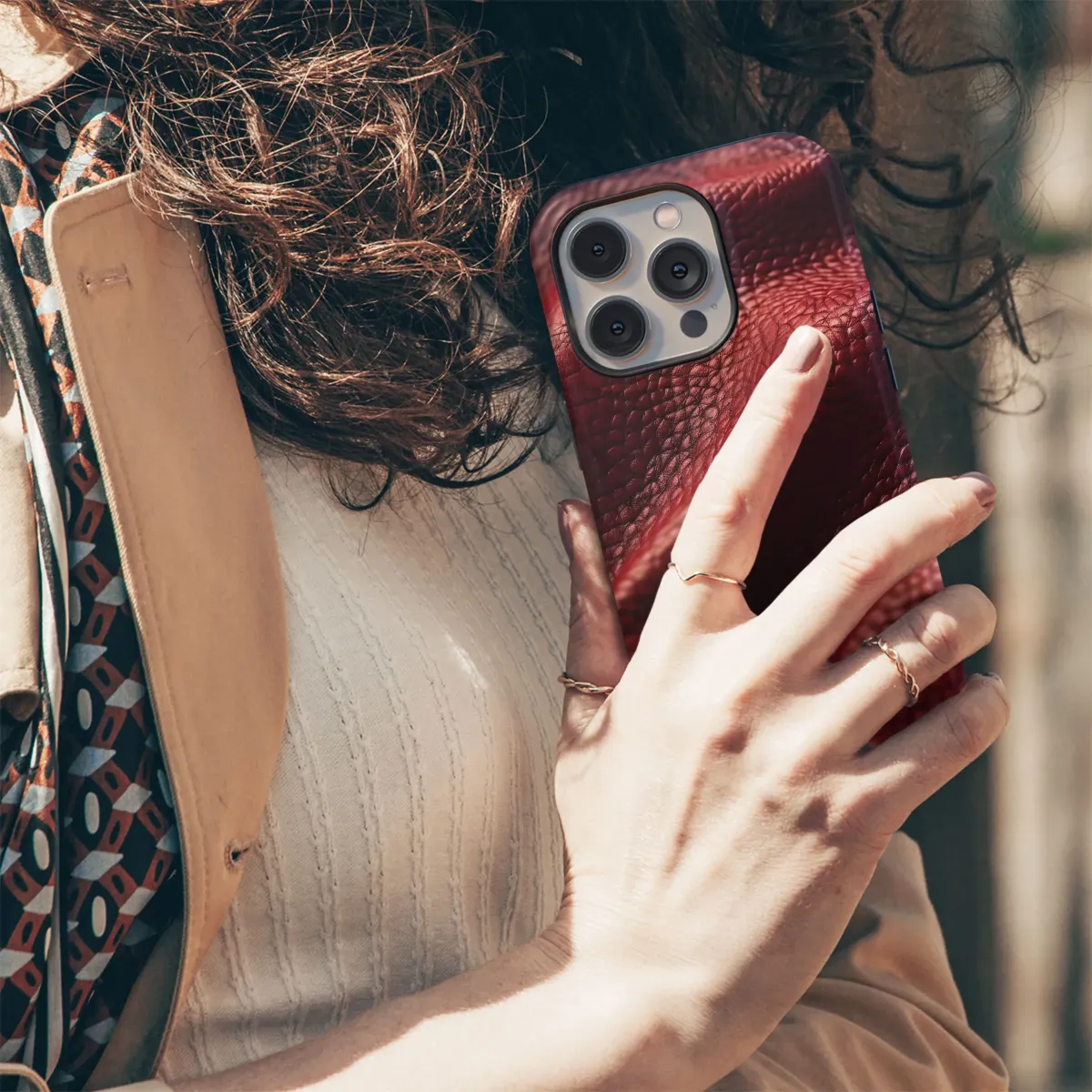 Crimson leather texture meets premium protection. Stylish iPhone, Samsung, and Pixel case with a luxurious feel. Safeguard your phone in sophisticated red.
