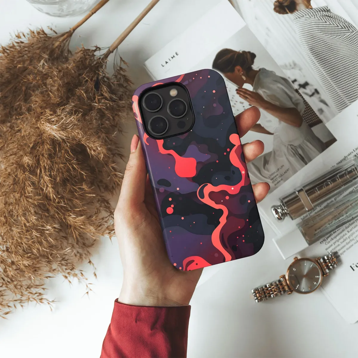 Introducing the Crimson Nebula Flow Phone Case, a celestial masterpiece that will transform your device into a cosmic wonder. Immerse yourself in vibrant hues of red, pink, and purple that swirl together like a distant nebula, creating an ethereal and captivating effect. Crafted from high-quality materials, this phone case not only protects your device from scratches and bumps but also adds a touch of cosmic flair to your life. Its slim design complements the sleek lines of your phone, while the precise cutouts ensure easy access to all ports and buttons. Whether you're an avid stargazer, a lover of vibrant colors, or simply appreciate the beauty of the cosmos, the Crimson Nebula Flow Phone Case is an essential accessory that will ignite your imagination and transport you to the celestial realm.