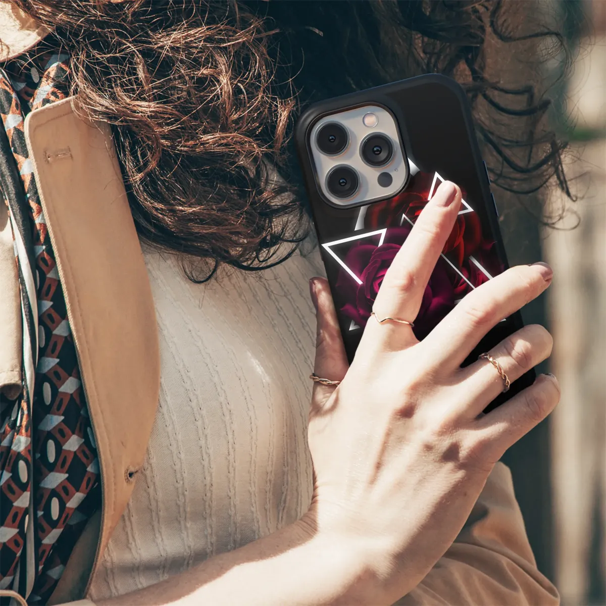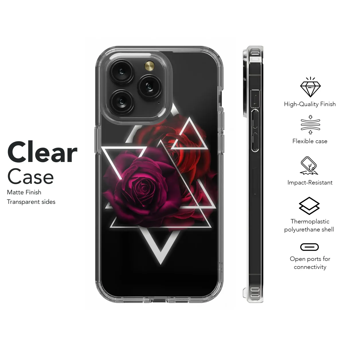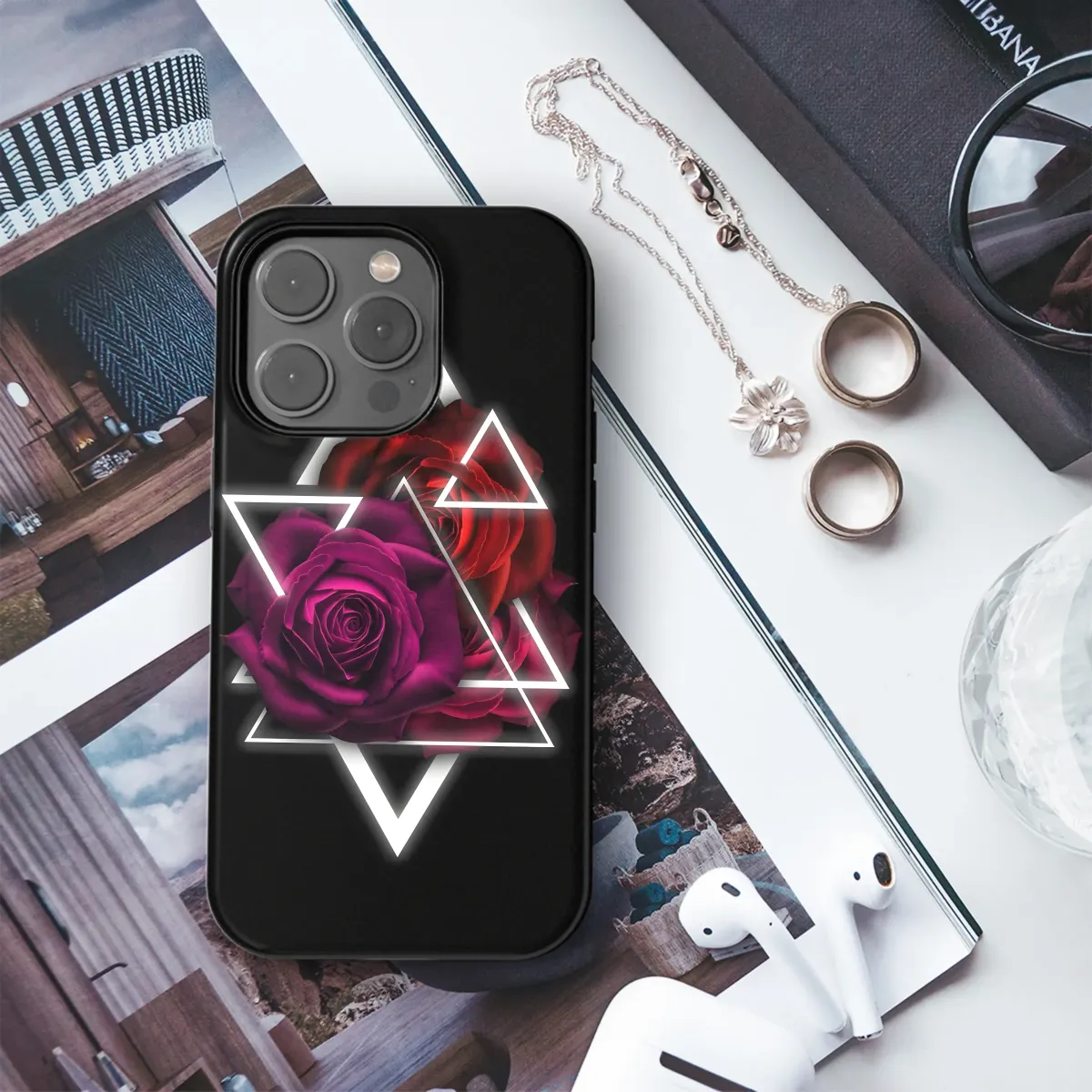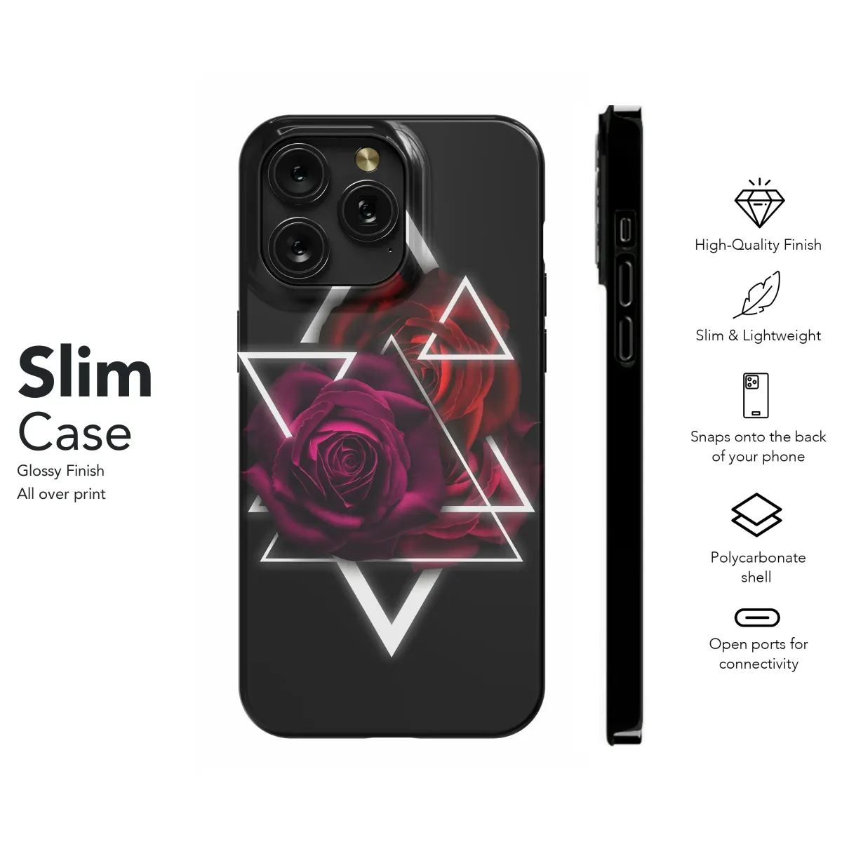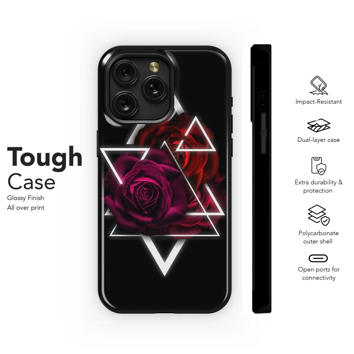 Elevate your style with this captivating design featuring a rich, dark rose accented by a striking geometric pattern. The deep crimson and burgundy hues of the roses create a luxurious and mysterious aesthetic, perfectly complemented by the sharp contrast of the white triangular framework. This bold graphic is a statement piece, showcasing a blend of romantic floral elements and modern geometric design. Its sophisticated and edgy style is perfect for those who appreciate unique, eye-catching art. The high-resolution print ensures vibrant colors and sharp details, making it a durable and stylish accessory that will turn heads. This design transforms your everyday carry into a personalized work of art, reflecting your individual style and adding a touch of modern elegance. Add a touch of gothic romance and geometric chic to your personal accessories and express your unique personality. Perfect for adding a distinctive edge to your look, this design guarantees a captivating and memorable style upgrade. Order yours today and make a statement!
