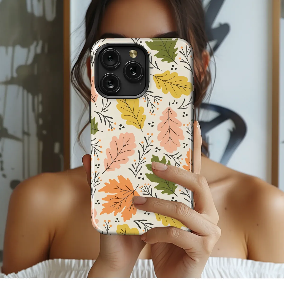 Embrace the cozy spirit of the season with this enchanting autumnal design. Imagine a crisp walk through a sun-dappled forest, where leaves of every hue gently drift to the ground. This beautiful pattern captures that magical moment, featuring a whimsical dance of oak and maple leaves in a warm, rustic palette. Rich oranges, earthy olive greens, sunny yellows, and soft blush pinks create a vibrant tapestry against a creamy, off-white background. Delicate hand-drawn twigs and tiny clusters of berries add a touch of intricate detail, enhancing the design’s charming, botanical feel. The subtle texture gives it an authentic, artistic quality, as if painted just for you. This design is more than just a pattern; it's a feeling—the warmth of a spiced latte, the comfort of a favorite sweater, and the simple joy of nature's changing colors. It's the perfect way to carry the heartwarming aesthetic of fall with you every day, a delightful accessory for any nature lover or a thoughtful gift for someone special who cherishes the magic of harvest time. Let this piece of art add a touch of modern, rustic elegance to your daily essentials.