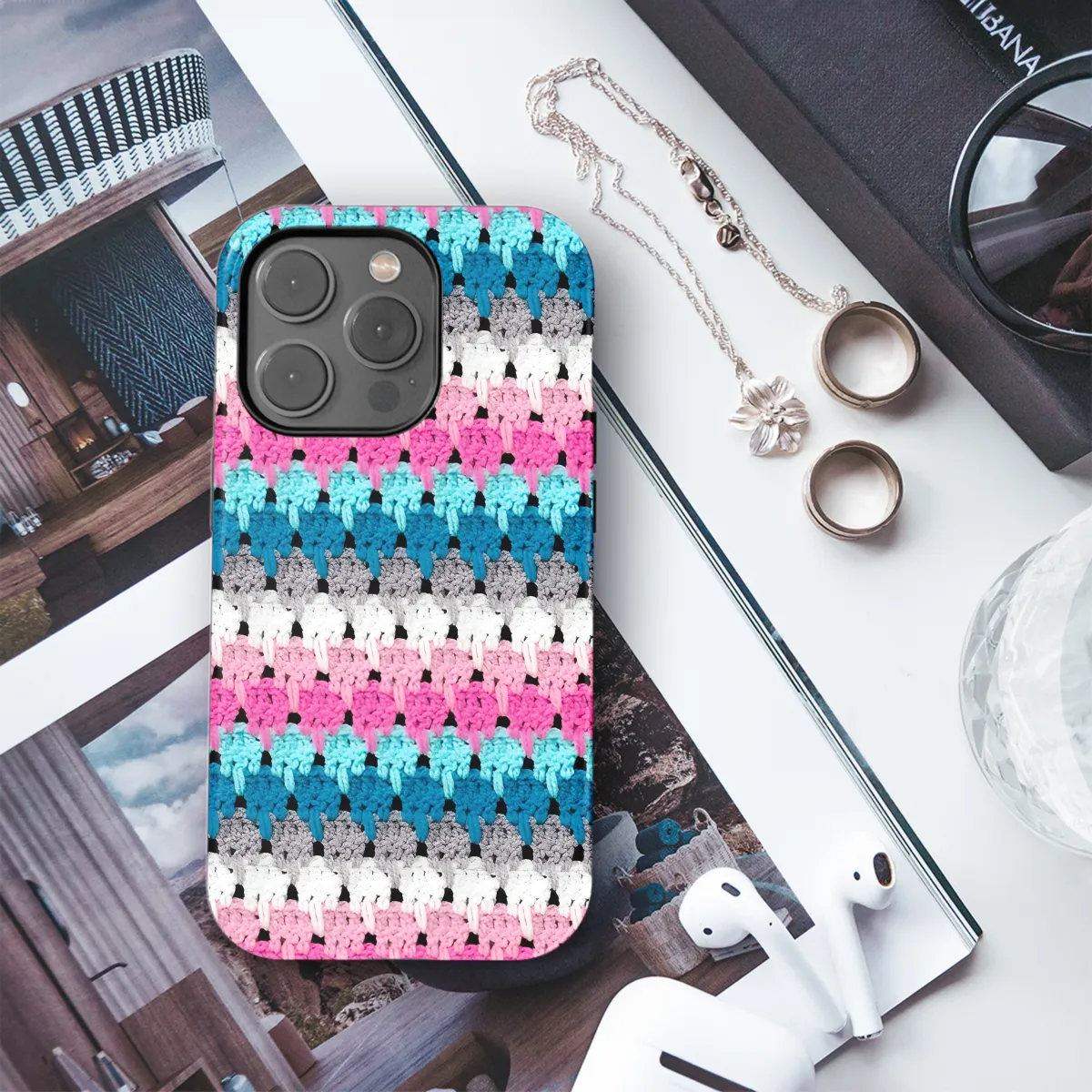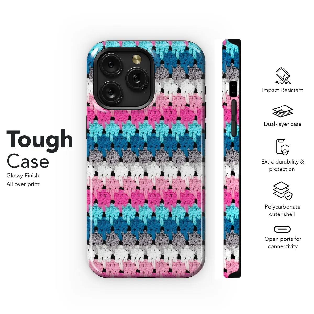 Elevate your phone's style with our enchanting crocheted phone case. This exquisitely handmade cover boasts a vibrant array of pastel hues, adding a touch of whimsy to your daily essentials. Crafted with meticulous attention to detail, the intricate crochet pattern provides a secure and comfortable grip, ensuring your phone is protected and easy to use. Choose from a range of sizes to perfectly fit your iPhone, Samsung, or Pixel device. Embrace the bohemian charm and protect your phone in style with our stunning crocheted phone case.