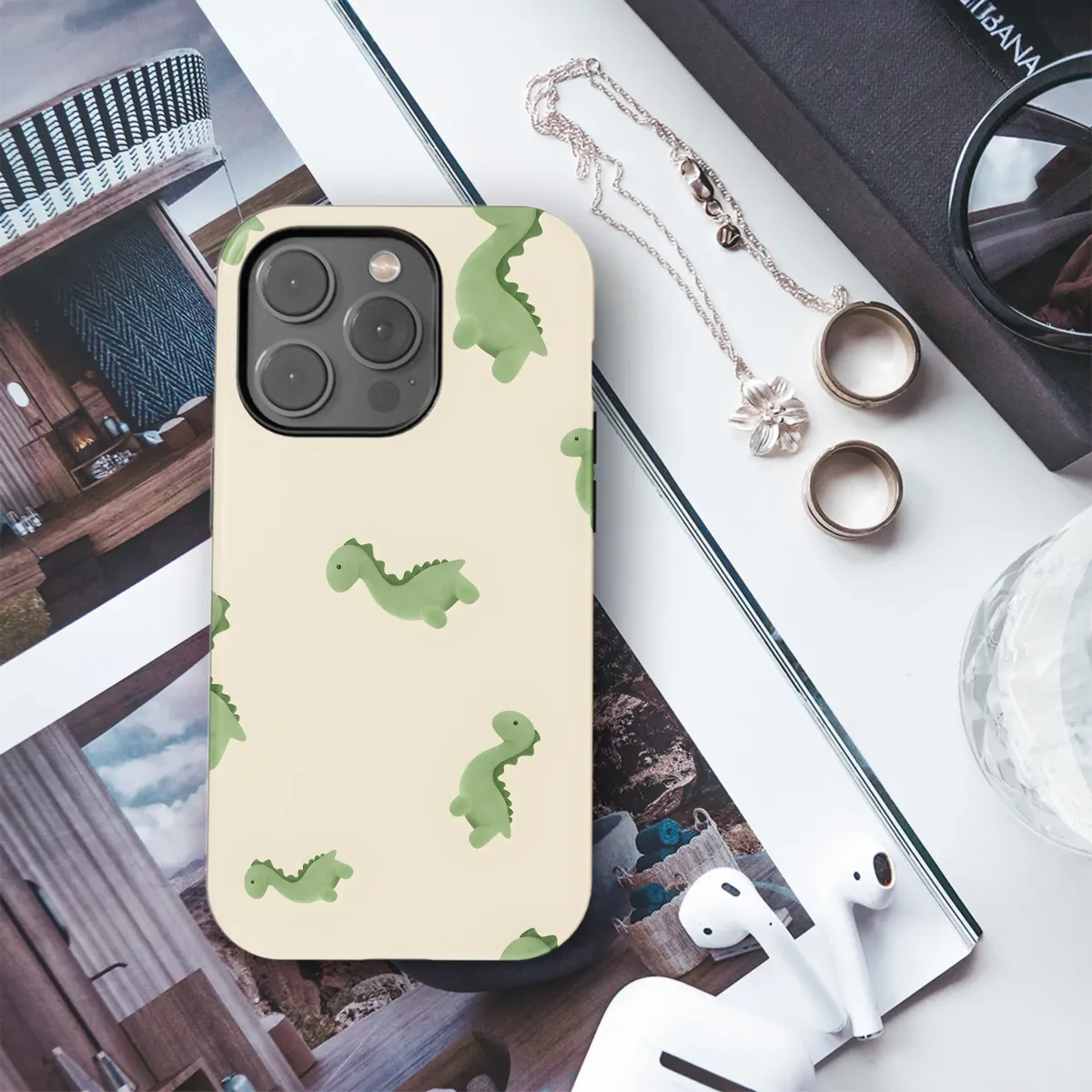 Add a prehistoric touch to your everyday essentials with this adorable dinosaur design. Featuring charming, soft green dinos playfully scattered across a soothing cream background, this pattern is perfect for adding a touch of whimsy to your style. The delightful illustrations evoke a sense of childhood wonder and create a fun, yet sophisticated aesthetic. This design is printed with high-quality, vibrant inks to ensure a long-lasting, eye-catching look that won't fade. It's durable enough to withstand daily wear and tear, yet lightweight and comfortable to hold. The design is versatile and suitable for individuals of all ages who appreciate charming, unique patterns. This makes a fantastic gift for dinosaur enthusiasts, children, or anyone seeking a playful and stylish accessory. Express your personality and love for all things cute with this delightful and distinctive print. The subtle color palette complements various styles and outfits, providing a fun addition to your wardrobe. This lovely piece is sure to bring a smile to your face each time you use it! Get yours today and let your style roar!