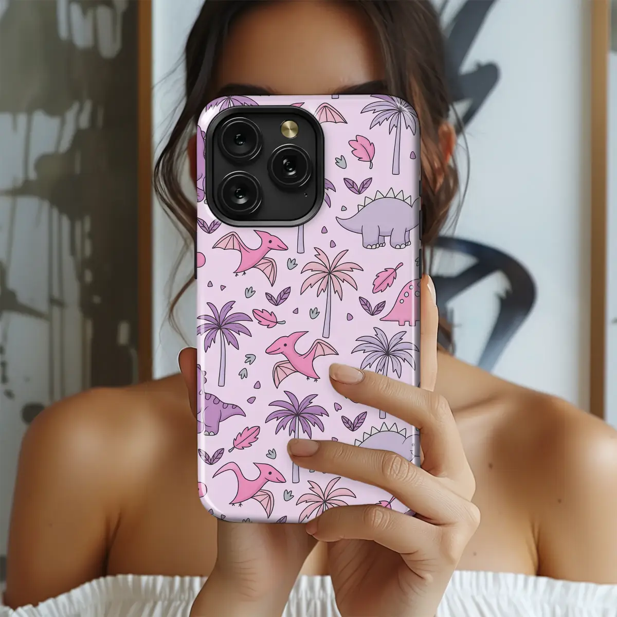 Embrace prehistoric fun with this adorable dinosaur illustration. The charming design features a playful pattern of cute cartoon dinosaurs, including T-Rex and Pterodactyls, rendered in a sweet pastel palette of pink and purple. Scattered amongst the friendly dinos are stylized palm trees and leaves, creating a delightful and whimsical scene for anyone who loves a cute aesthetic.