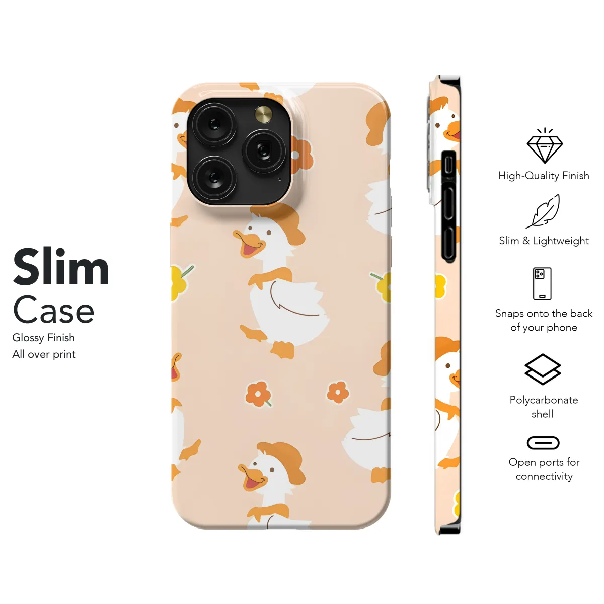 Protect your precious phone in adorable style with our Cute Duck Tiny Flower Phone Case! Designed specifically for iPhone, Samsung, and Pixel models, this case boasts a vibrant duck print adorned with delicate flowers. Its durable material ensures ultimate protection against scratches, dings, and everyday wear. The slim profile fits snugly on your phone without adding bulk, providing a perfect blend of style and functionality. Show off your unique personality with this charming phone case that's as cute as it is protective!