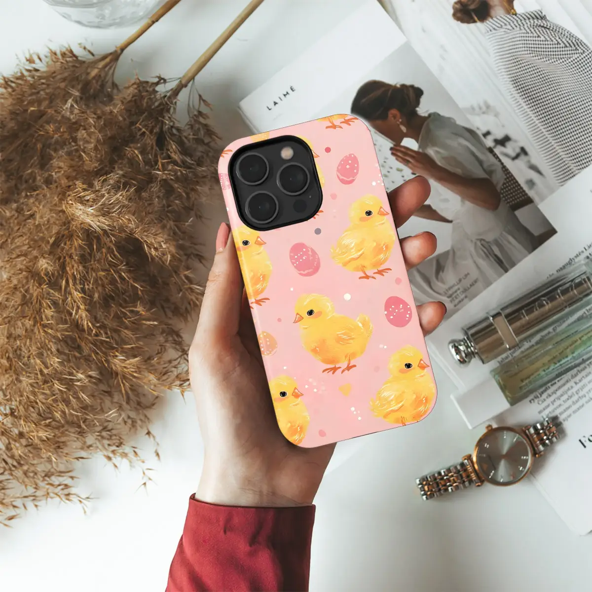 Embrace the joy of spring with this adorable Easter chick and egg pattern. The charming design features fluffy yellow baby chicks scattered across a lovely textured pink background. Alongside the sweet chicks, you'll find beautifully decorated Easter eggs in shades of pink and orange, adding a festive touch. The whimsical, painterly style brings a soft and playful feel, perfect for celebrating the season or for anyone who loves cute animal designs.