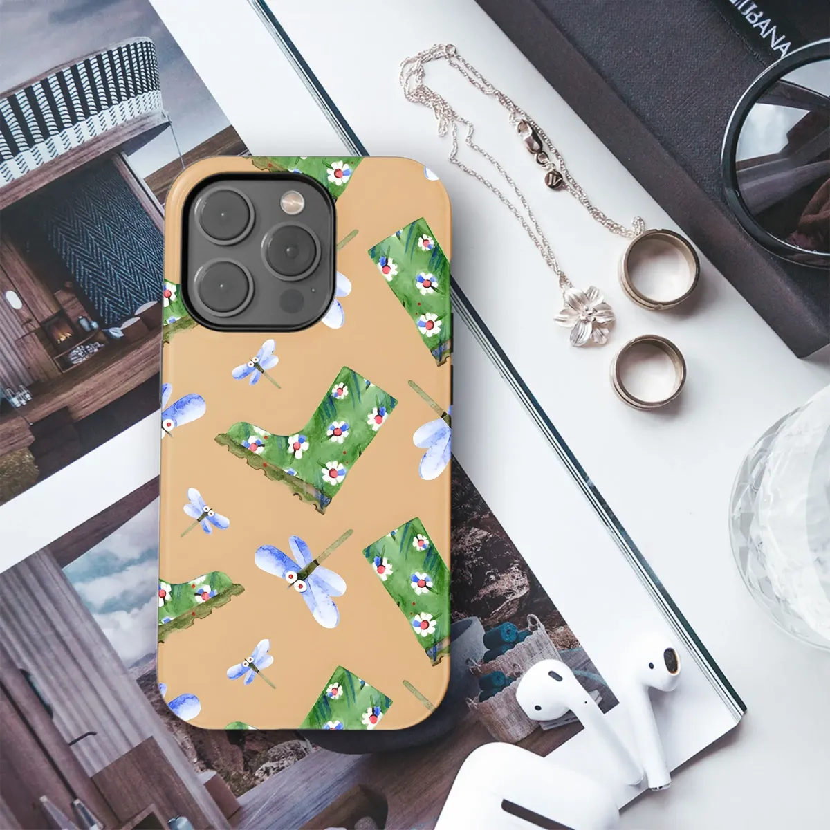 Bring a splash of springtime joy to your everyday with this delightful watercolor pattern. Featuring charming illustrations of vibrant green wellington boots adorned with sweet white flowers, this design captures the essence of a whimsical garden stroll. Playful blue dragonflies with bright red eyes dance amongst the floral boots, adding a touch of magical movement to the scene. The soft brown background provides a warm, earthy contrast, making the cheerful elements pop. This unique design is hand-painted with care, offering a fresh, artistic feel perfect for adding personality to any surface. Whether you're a nature lover, a fan of garden aesthetics, or simply appreciate cute and colorful art, this pattern brings a sense of lighthearted fun. It's ideal for custom printing, allowing you to carry a piece of this enchanting artwork with you wherever you go. The detailed floral and insect elements create a rich, engaging visual tapestry that is both eye-catching and charming. Use this beautiful, original design to personalize your favorite item and express your unique style. It makes a wonderful gift for anyone who loves whimsical art, gardening themes, or unique, handcrafted-style patterns. Enjoy the intricate details and the cheerful vibe of this lovely nature-inspired print.