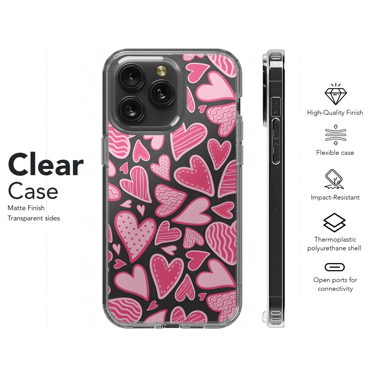 Showcase your style with this adorable Hearts Pattern Phone Case! Designed to fit snugly around your iPhone, Samsung, or Pixel, it's the perfect way to protect your device while adding a touch of charm. The vibrant heart pattern is eye-catching and playful, instantly elevating your everyday look. Whether you're sending messages, snapping pictures, or scrolling through your favorite apps, this case will keep your phone looking as good as new. Get ready to steal hearts every time you take out your phone!