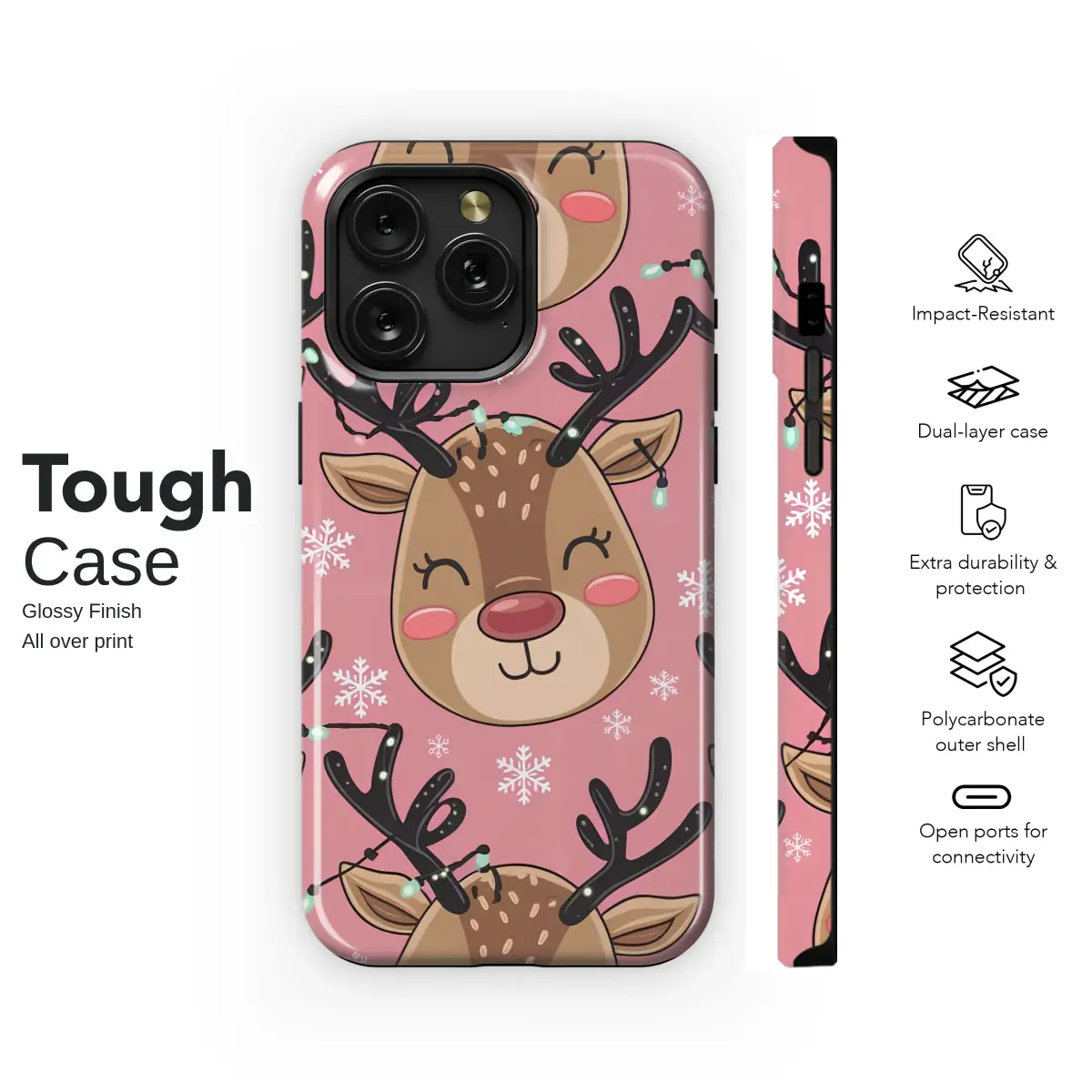 Embrace the holiday spirit with this adorable pink Christmas design. This festive pattern showcases cute, smiling reindeer faces with rosy cheeks, their antlers playfully tangled in glowing Christmas lights. Set against a cheerful pink background dotted with delicate white snowflakes, this charming illustration adds a touch of whimsical, kawaii joy to your holidays.