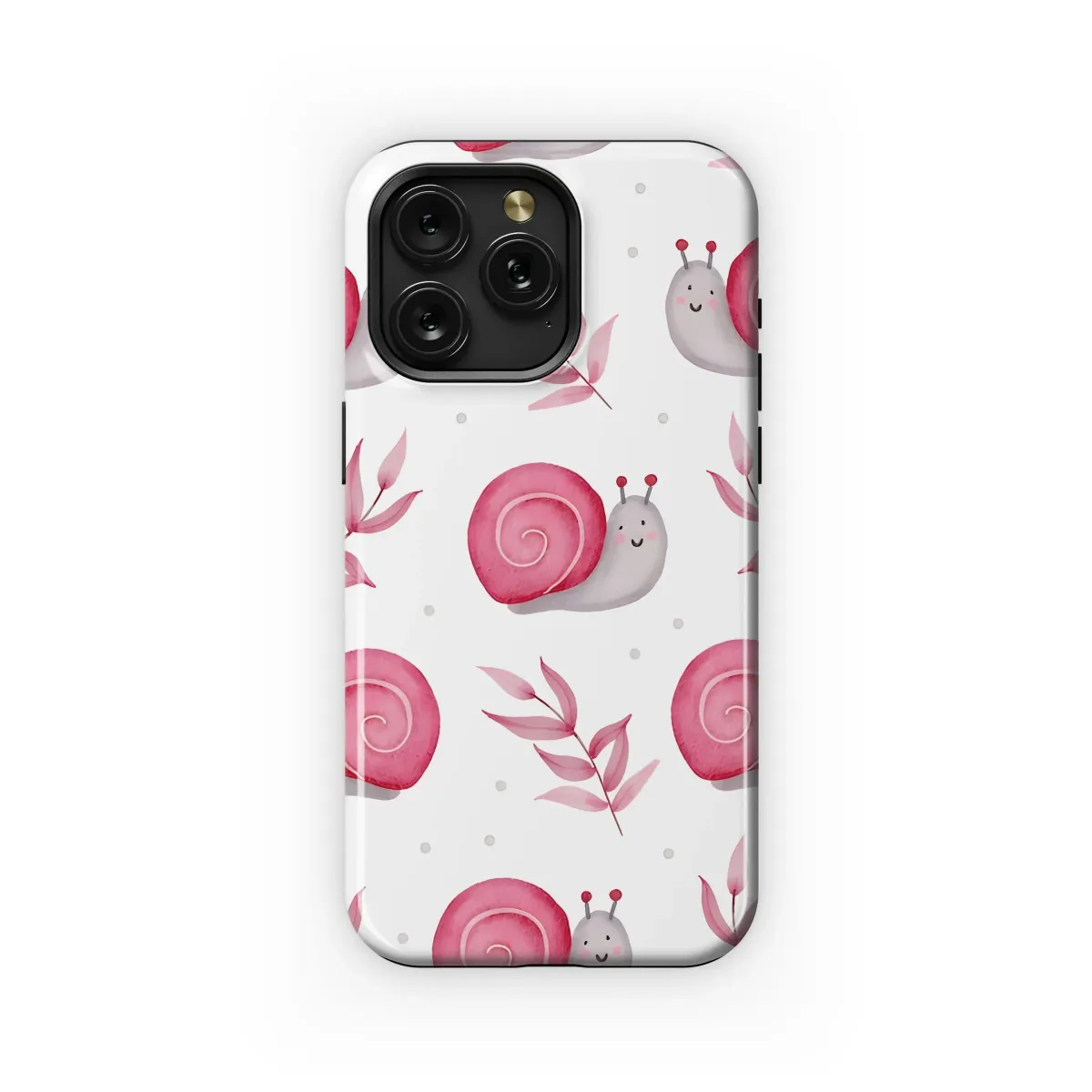 Discover this utterly delightful pattern featuring charming creatures from the garden! This whimsical nature print showcases adorable snails, each sporting a vibrant pink spiral shell, their gentle grey bodies peeking out with sweet, smiling faces. Interspersed among these delightful mollusks are delicate botanical elements – soft pink watercolor leaves and branches that add an elegant, ethereal touch to the overall design. Set against a clean white backdrop accented with subtle grey dots, the repeating motif creates a sense of simple beauty and playful enchantment. Perfect for adding a touch of personality and aesthetic appeal to your chosen item, this charming pattern is printed with exquisite detail, bringing this sweet garden scene to life. It's more than just a design; it's a statement piece, a tiny portable art gallery, reflecting your love for nature, whimsical art, and all things cute. Whether you're treating yourself or seeking a unique gift for someone special who appreciates charming animal patterns and botanical prints, this is a beautiful way to personalize an everyday essential with a delightful touch of the outdoors and soft, inviting colors. This unique accessory print offers style and individuality, ensuring your item stands out with its adorable creatures and charming composition, making it a truly unique and treasured piece.