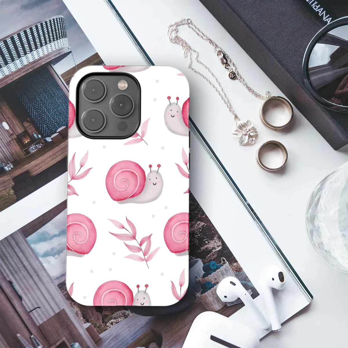 Discover this utterly delightful pattern featuring charming creatures from the garden! This whimsical nature print showcases adorable snails, each sporting a vibrant pink spiral shell, their gentle grey bodies peeking out with sweet, smiling faces. Interspersed among these delightful mollusks are delicate botanical elements – soft pink watercolor leaves and branches that add an elegant, ethereal touch to the overall design. Set against a clean white backdrop accented with subtle grey dots, the repeating motif creates a sense of simple beauty and playful enchantment. Perfect for adding a touch of personality and aesthetic appeal to your chosen item, this charming pattern is printed with exquisite detail, bringing this sweet garden scene to life. It's more than just a design; it's a statement piece, a tiny portable art gallery, reflecting your love for nature, whimsical art, and all things cute. Whether you're treating yourself or seeking a unique gift for someone special who appreciates charming animal patterns and botanical prints, this is a beautiful way to personalize an everyday essential with a delightful touch of the outdoors and soft, inviting colors. This unique accessory print offers style and individuality, ensuring your item stands out with its adorable creatures and charming composition, making it a truly unique and treasured piece.