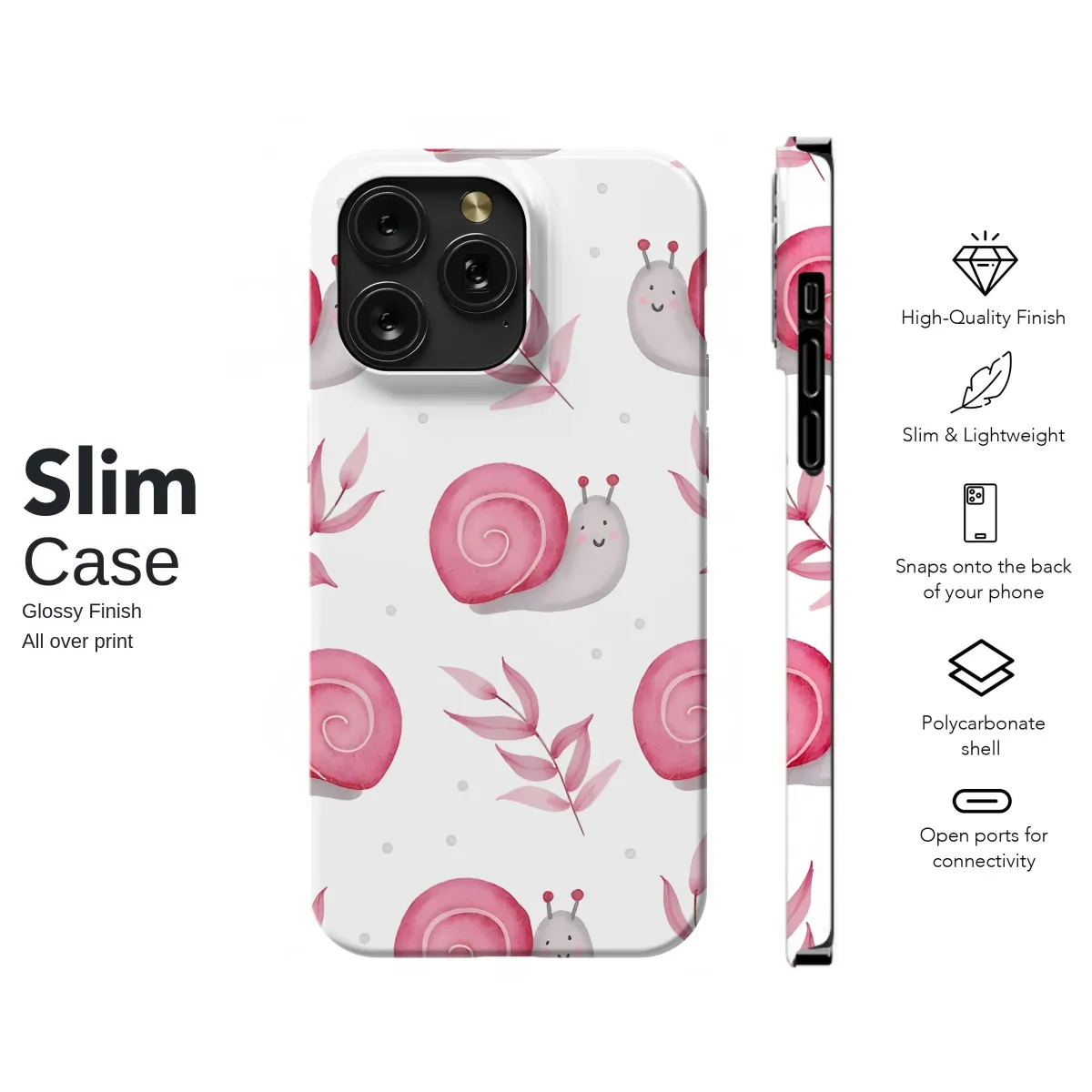 Discover this utterly delightful pattern featuring charming creatures from the garden! This whimsical nature print showcases adorable snails, each sporting a vibrant pink spiral shell, their gentle grey bodies peeking out with sweet, smiling faces. Interspersed among these delightful mollusks are delicate botanical elements – soft pink watercolor leaves and branches that add an elegant, ethereal touch to the overall design. Set against a clean white backdrop accented with subtle grey dots, the repeating motif creates a sense of simple beauty and playful enchantment. Perfect for adding a touch of personality and aesthetic appeal to your chosen item, this charming pattern is printed with exquisite detail, bringing this sweet garden scene to life. It's more than just a design; it's a statement piece, a tiny portable art gallery, reflecting your love for nature, whimsical art, and all things cute. Whether you're treating yourself or seeking a unique gift for someone special who appreciates charming animal patterns and botanical prints, this is a beautiful way to personalize an everyday essential with a delightful touch of the outdoors and soft, inviting colors. This unique accessory print offers style and individuality, ensuring your item stands out with its adorable creatures and charming composition, making it a truly unique and treasured piece.