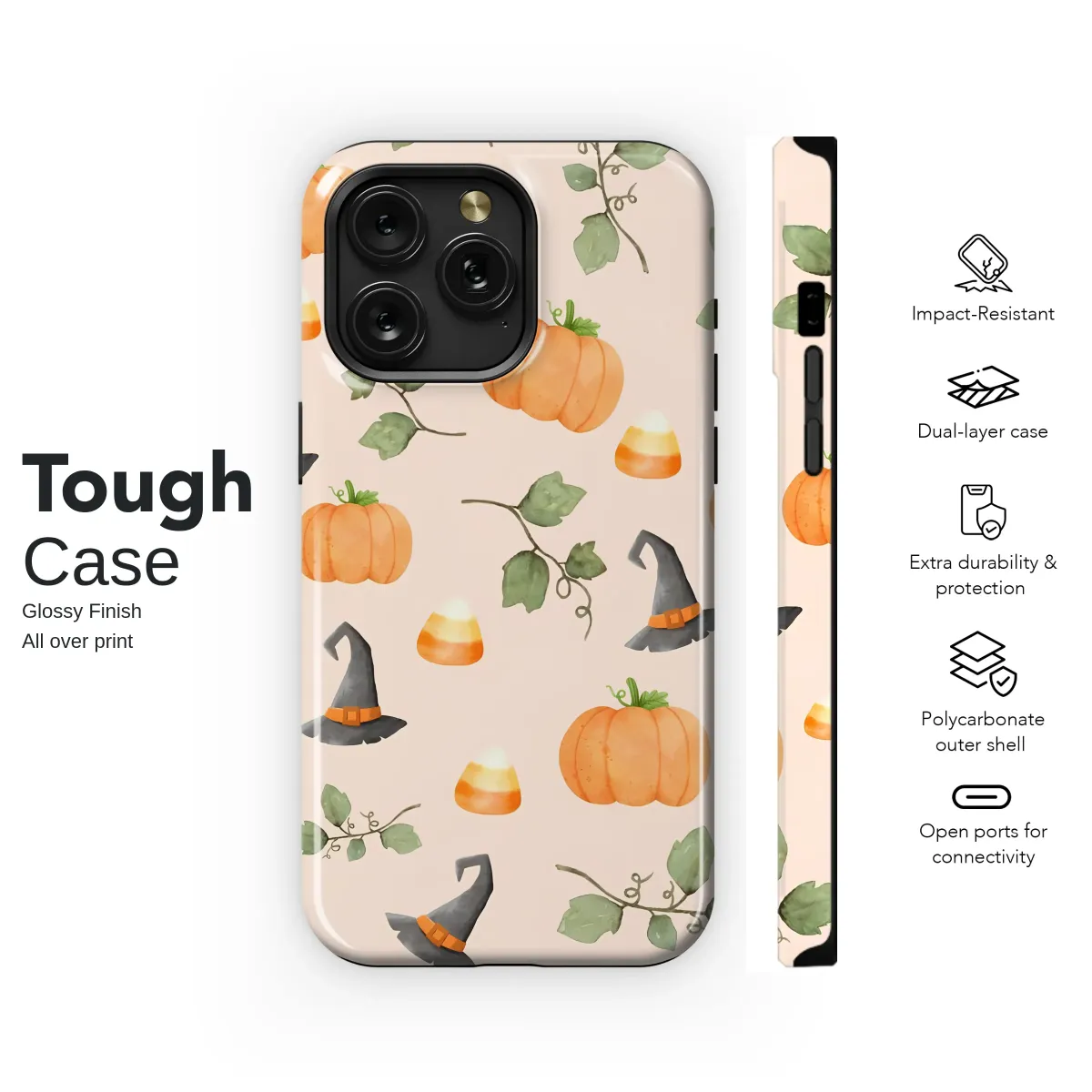Step into a whimsical wonderland where autumn's magic comes to life! This enchanting design captures the heart of spooky season with a delightful, modern twist. Imagine a sun-drenched pumpkin patch painted in soft, dreamy watercolors, where plump orange pumpkins nestle amongst twisting green vines, their forms glowing with warmth. Playful witch hats, with their charmingly crooked peaks and bright orange bands, are tossed about as if left behind by a friendly sorceress after a night of festive spells. Sprinkled throughout this charming scene are sweet candy corns, their iconic tri-color stripes adding a touch of nostalgic delight and evoking memories of crisp trick-or-treating adventures under a harvest moon. The entire pattern is set against a warm, blush-peach backdrop, creating a gentle and contemporary aesthetic that celebrates the season in a chic, understated way. This artwork isn't just a pattern; it's an invitation to carry the cozy, joyful spirit of Halloween with you every day. Let its unique, hand-painted charm adorn your most-used accessory, transforming it into a beautiful statement piece that's equal parts sweet, spooky, and utterly stylish. It’s the perfect gift for a fellow fall enthusiast or a special treat to showcase your love for the most magical time of the year.