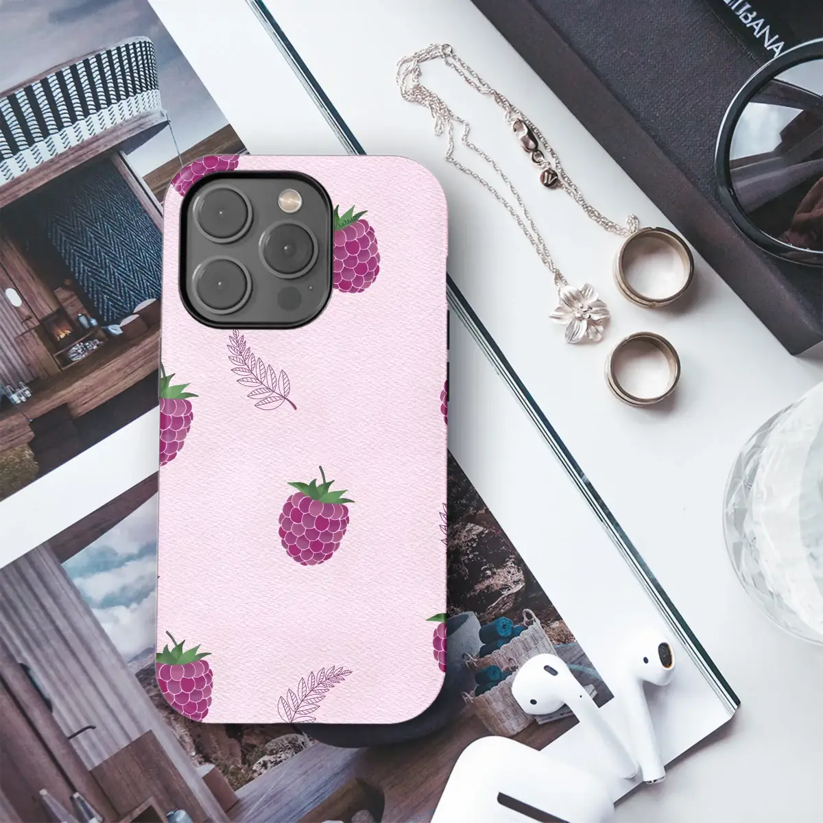 Embrace a sweet, summery vibe with this charming raspberry fruit illustration. This delightful design features juicy purple raspberries and delicate botanical leaf sketches scattered across a lovely textured pink background, perfect for adding a touch of nature-inspired art to your daily essentials.