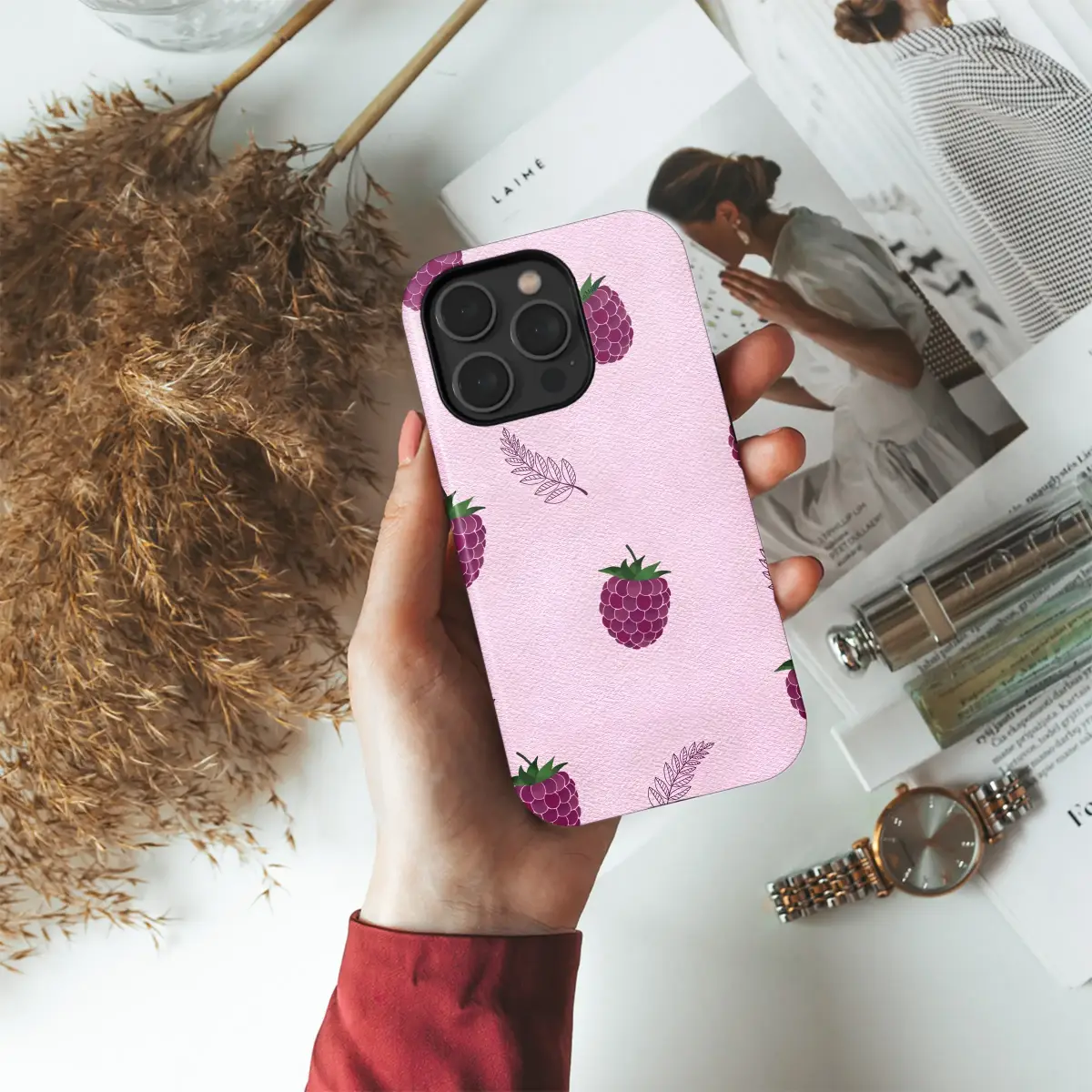 Embrace a sweet, summery vibe with this charming raspberry fruit illustration. This delightful design features juicy purple raspberries and delicate botanical leaf sketches scattered across a lovely textured pink background, perfect for adding a touch of nature-inspired art to your daily essentials.