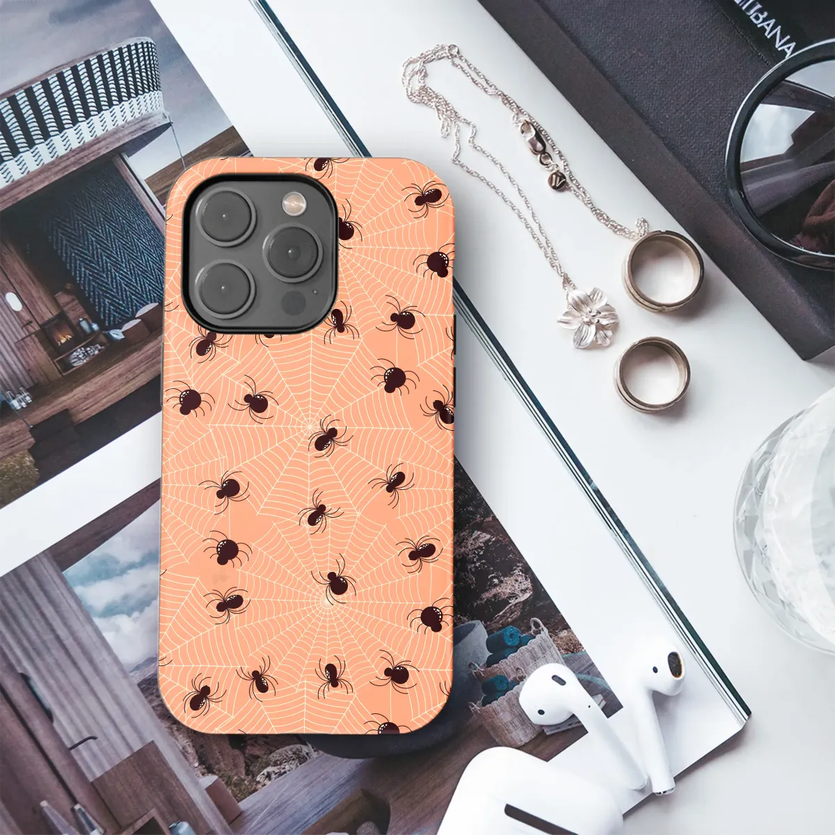 Embrace the charming side of spooky season with this captivating design, a perfect blend of Halloween delight and whimsical artistry. Picture a warm, peach-orange canvas that glows with the gentle light of an autumn sunset, intricately patterned with a mesmerizing labyrinth of delicate, creamy white spiderwebs. Across this intricate network, dozens of friendly little black spiders scuttle and play, their glossy, cartoonish silhouettes creating a dynamic and eye-catching repeat pattern that draws you in. This isn't just a design; it's a celebration of the enchantingly eerie, capturing a mood that's more sweet than scary, perfect for those who love a touch of goth aesthetic with a playful twist. The clean lines and bold, contrasting color palette make it a standout accessory, perfect for adding a pop of personality and festive spirit to your most-used items. It’s an ideal way to carry a piece of your favorite fall season with you all year round, or a thoughtful and unique gift for the Halloween lover, arachnid admirer, or anyone with a quirky, alternative style in your life. Let this unique, creepy-crawly pattern wrap your favorite gear in a web of undeniable charm and spooky-cute style, making every day feel a little more magical and wonderfully weird.