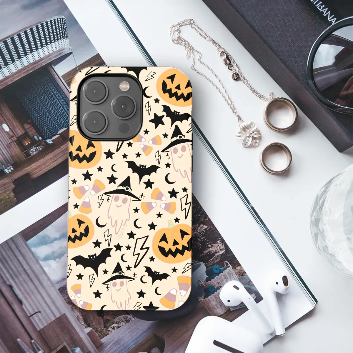 Embrace the enchanting spirit of spooky season with this utterly charming and whimsical artwork. Set against a warm, creamy backdrop, a delightful pattern of Halloween magic comes to life, perfect for anyone who adores a cute and cozy autumn aesthetic. Follow the friendly little ghosts, each donning a tiny witch hat, as they float playfully amidst a galaxy of black stars, crescent moons, and zappy lightning bolts. Cheerful jack-o'-lanterns grin with classic glee, while sweet candy corn scatters like festive confetti, adding a pop of nostalgic color. In this delightful chaos, silhouetted bats take flight, completing the perfect fall night scene. This spooky cute design is a celebration of all things fun and festive about Halloween, blending a playful doodle style with a warm, inviting color palette. It’s an ideal way to carry the joyful, whimsical energy of October with you, transforming your everyday essentials into a statement piece that whispers of crisp air, sweet treats, and gentle haunts. Let this enchanting pattern bring a smile to your face and a touch of handmade artistry to your personal style.