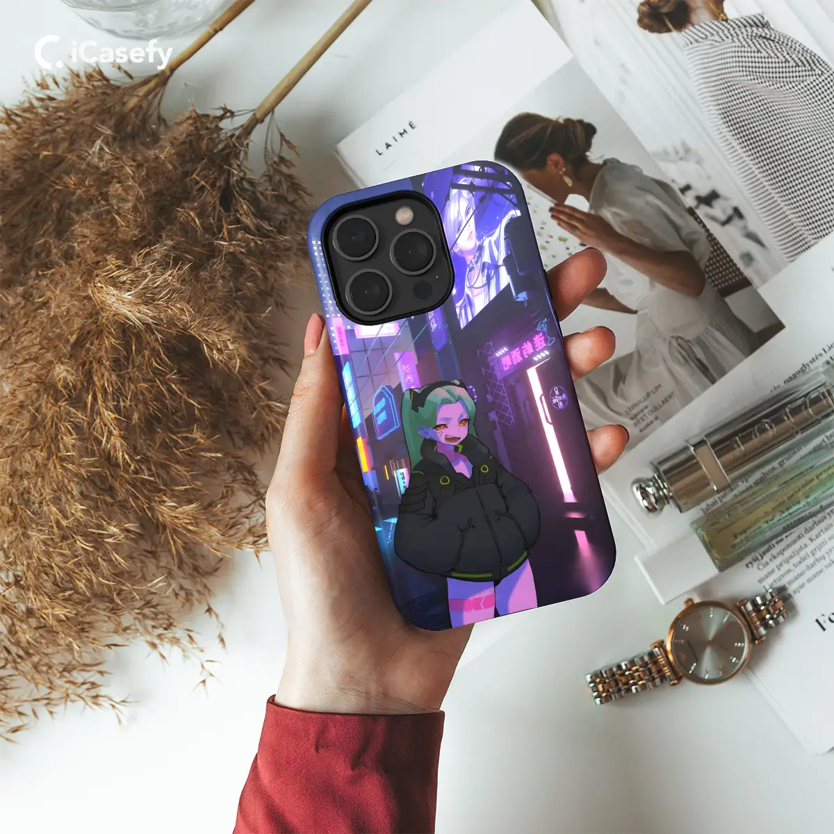 Step into the neon-lit streets of Night City with this exclusive Cyberpunk Edgerunners Anime phone case. Embody the swagger of Rebecca with this stylish cover that features vibrant artwork inspired by the beloved anime series. Available for iPhone, Samsung, and Pixel 6/90 devices, this case offers both style and protection