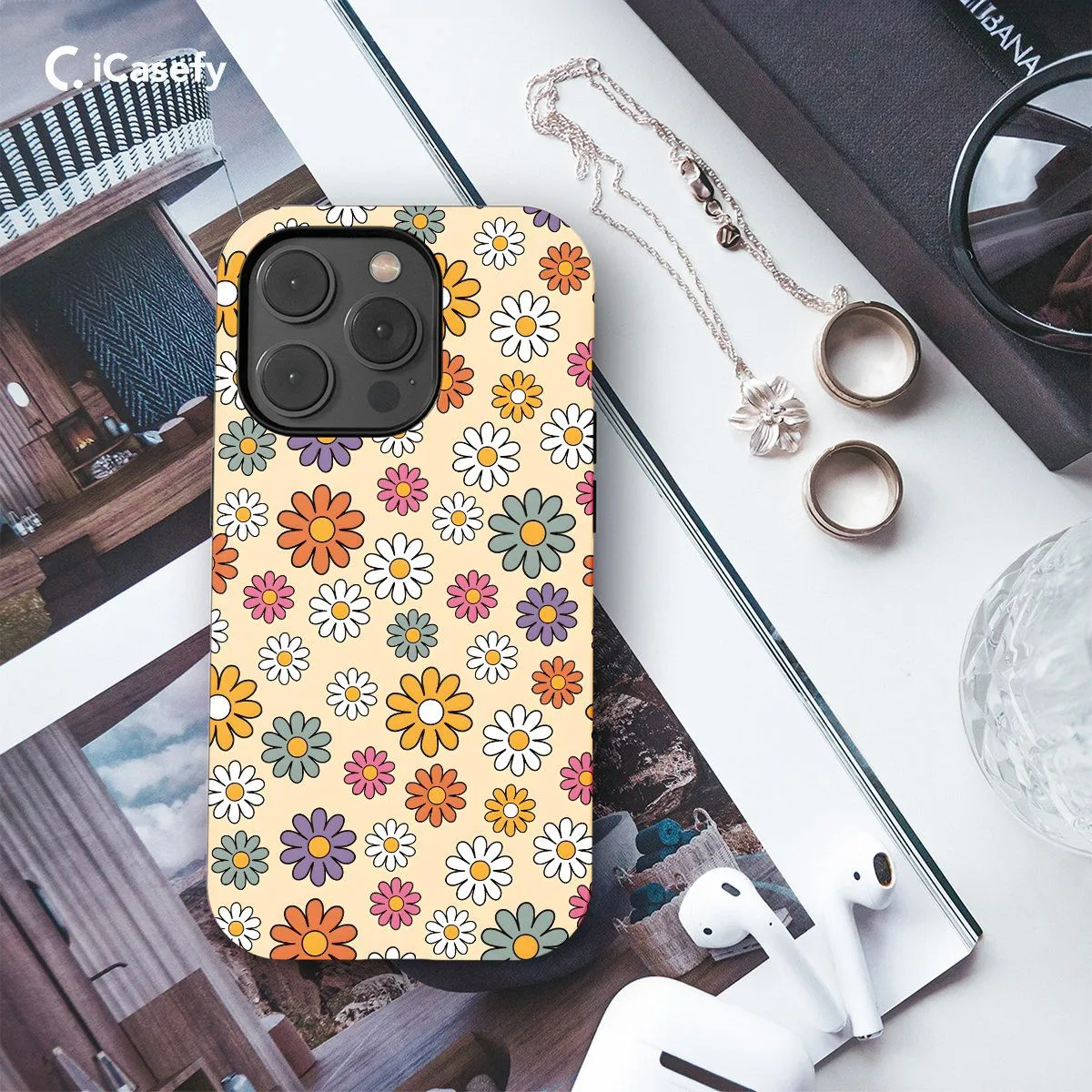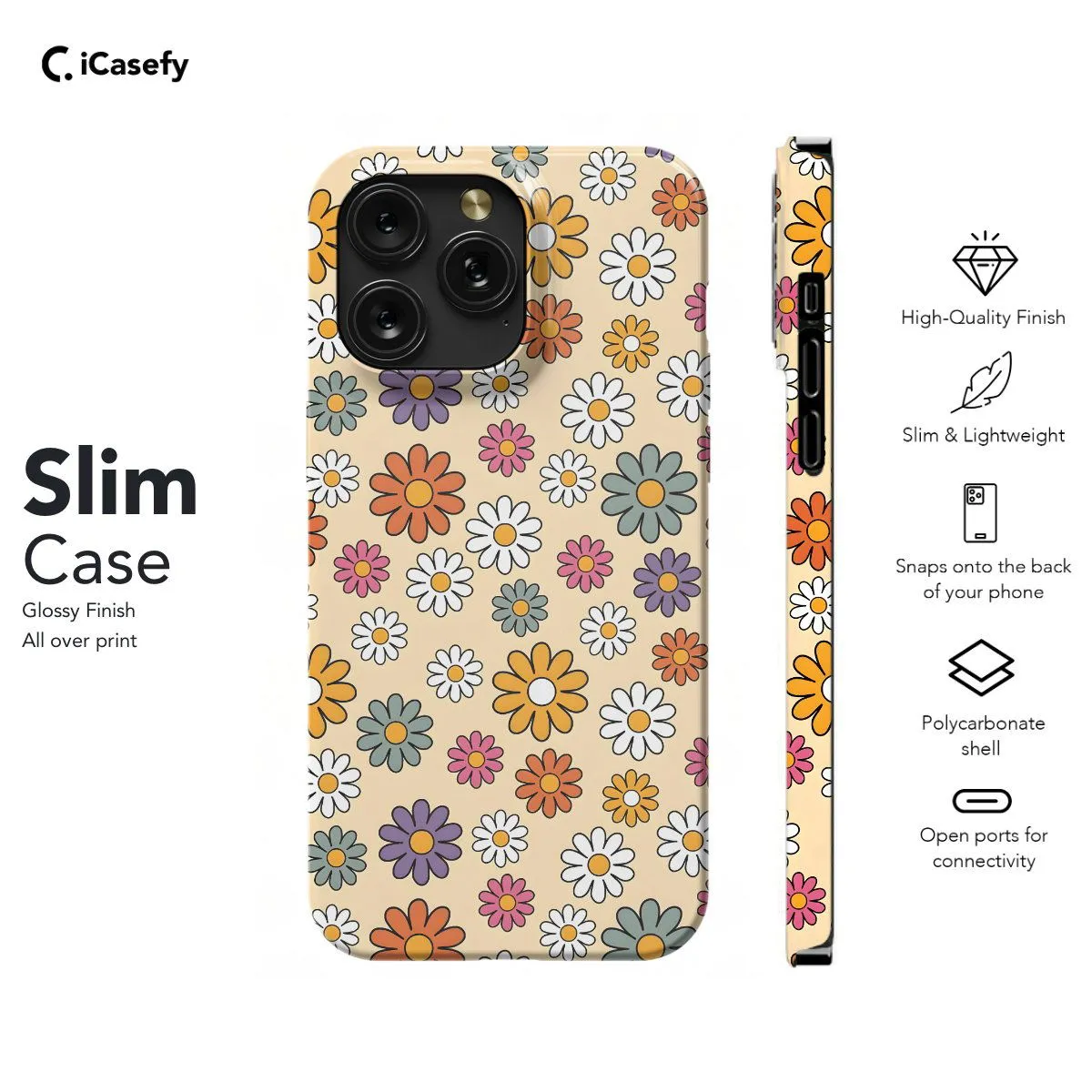 Elevate your device with the nostalgic charm of the 70s with this groovy phone case featuring a daisy flower pattern. Inspired by the vibrant and free-spirited aesthetics of the 1970s, this case brings a retro vibe to your modern device. Adorned with cheerful daisies in bright colors against a contrasting background, this case is perfect for adding a pop of retro flair to your everyday style. Let your phone become a statement piece with this fun and funky accessory reminiscent of the flower power era.