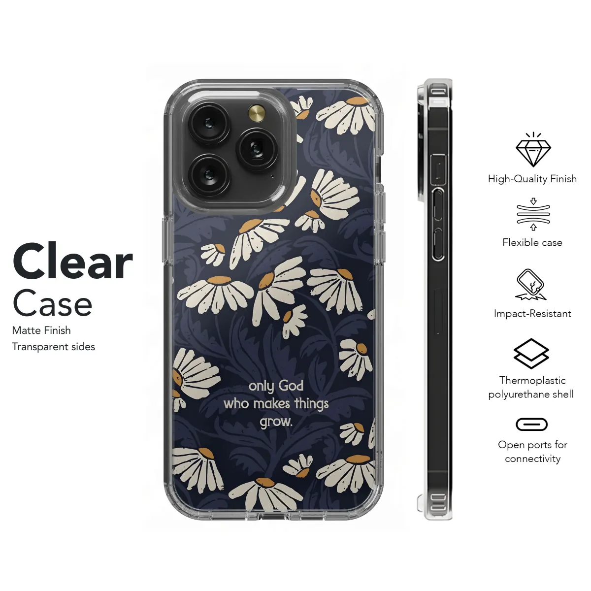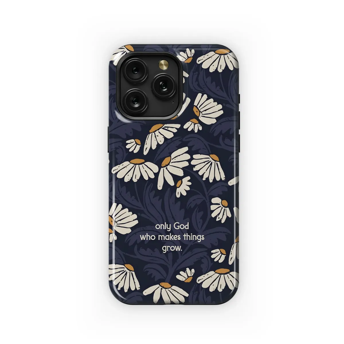 Adorn your device with the serene beauty of our "Grow in Grace" design! This faith-inspired floral art features a field of charming daisies set against a deep navy backdrop, intertwined with stylized foliage. The gentle reminder, "Only God who makes things grow," adds a touch of inspiration to your everyday carry. Perfect for those who love Christian art, nature-inspired aesthetics, or simply appreciate a unique and meaningful design. Express your faith and style with this elegant and protective accessory. This artful piece is more than just decoration; it's a daily affirmation of growth, faith, and the beauty of God's creation. Get yours today and carry a little inspiration with you everywhere you go! Suitable for gifting, spreading positivity, and celebrating the beauty of growth.