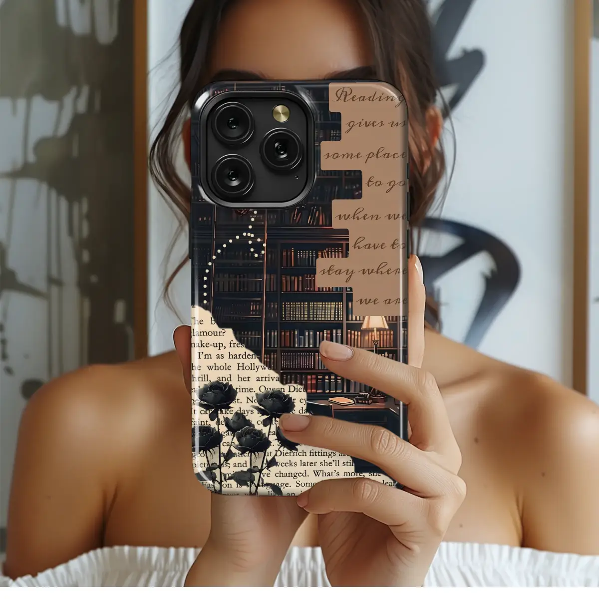 Embrace a cozy, literary aesthetic with this dark academia inspired collage design. This intricate artwork features a vintage library scene, a delicate butterfly, and elegant black roses set against a torn book page. The central focus is the poignant quote, 'Reading gives us some place to go when we have to stay where we are,' celebrating the magic of books. The warm, moody color palette makes it a sophisticated choice for any book lover.