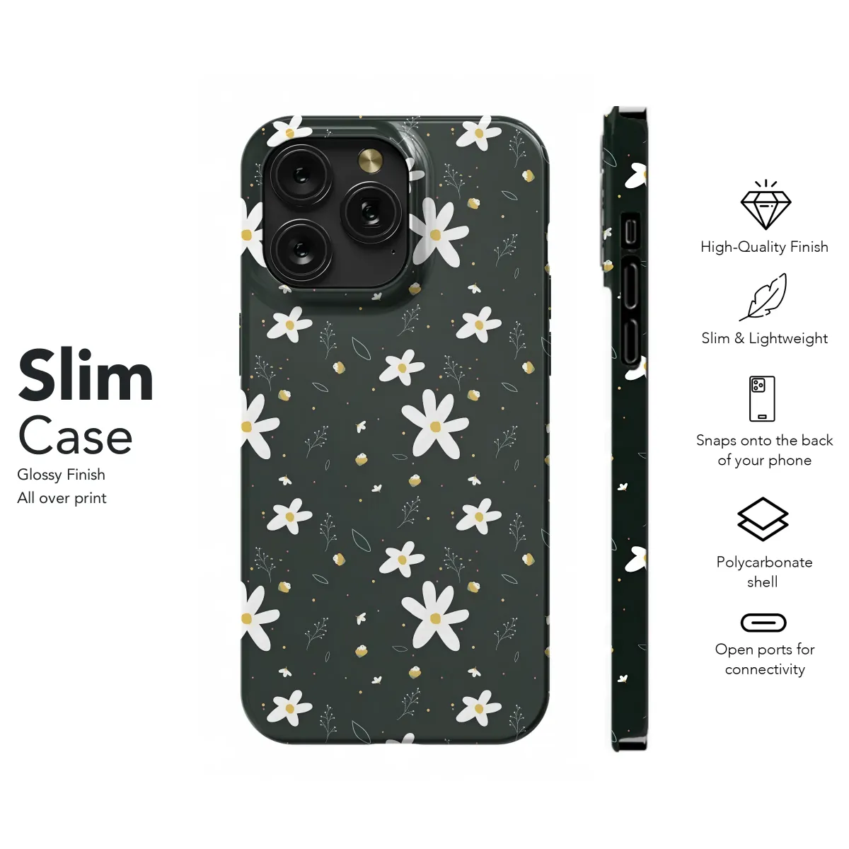 Adorn your device with this charming floral design featuring a delightful scattering of daisies and delicate sprigs on a deep, rich black background. This whimsical pattern is perfect for adding a touch of springtime elegance to your everyday essentials. The simplistic yet stylish aesthetic makes it suitable for a variety of tastes and personal styles. This high-quality print ensures vibrant, long-lasting colors that will remain bright and beautiful, even with daily use. Its sleek and stylish design adds a subtle yet sophisticated charm, making it an ideal accessory for the fashion-conscious individual. The carefully curated pattern offers a unique blend of minimalist design and cheerful floral accents. Bring a touch of nature's beauty to your world with this sophisticated and pretty design, showcasing a delicate balance of simplicity and charm. This delightful pattern is a perfect way to express your individual style and brighten up your day. The timeless appeal of the daisy print ensures that this design will remain a stylish favorite for years to come. This pretty design will bring joy to your everyday routine. Order yours today and experience the perfect combination of style and practicality.