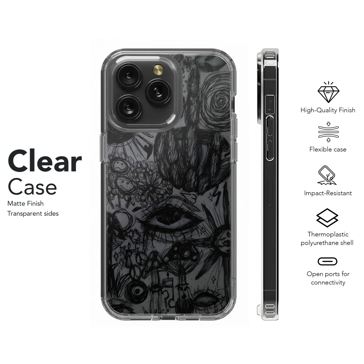 Dark, hand-drawn doodles create a unique, edgy look for your phone. Protect your iPhone, Samsung, or Pixel with this eye-catching case. Durable and stylish!