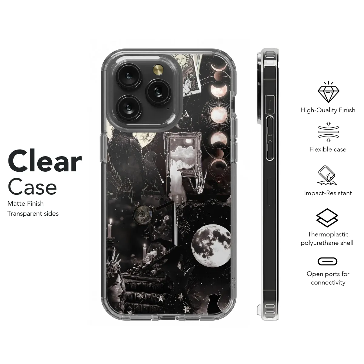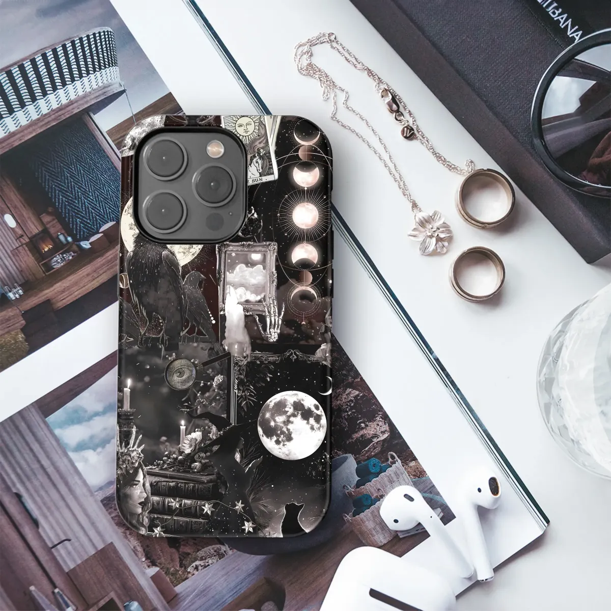 Embrace the mystical allure of this gothic celestial design. Featuring a captivating blend of celestial bodies, tarot imagery, ravens, and a touch of dark academia, this enchanting artwork is perfect for those who appreciate the beauty of the night sky and the mysteries of the universe. The intricate details and rich, monochromatic palette create a sophisticated and timeless aesthetic, making it a statement piece for any style. This design brings together elements of witchcraft, astrology, and moon phases for a unique and powerfully symbolic representation of the feminine mystique. Add a touch of magic to your everyday life with this captivating piece, expressing your individual style and passion for the esoteric. Its rich symbolism resonates with those drawn to lunar cycles, gothic aesthetics, and the captivating world of divination. This design is a perfect representation of dark romanticism and moonchild energy, capturing the essence of mystery and allure.
