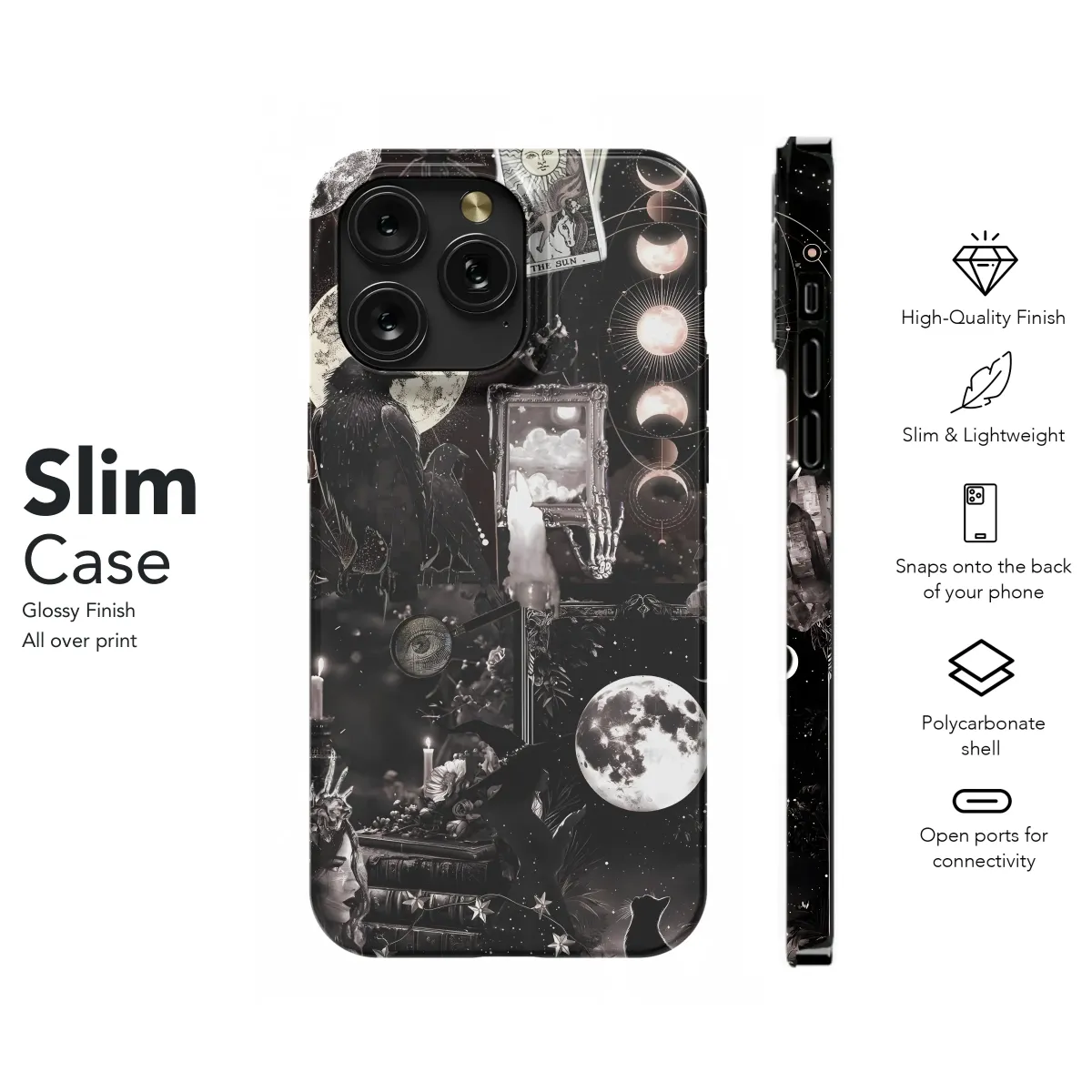 Embrace the mystical allure of this gothic celestial design. Featuring a captivating blend of celestial bodies, tarot imagery, ravens, and a touch of dark academia, this enchanting artwork is perfect for those who appreciate the beauty of the night sky and the mysteries of the universe. The intricate details and rich, monochromatic palette create a sophisticated and timeless aesthetic, making it a statement piece for any style. This design brings together elements of witchcraft, astrology, and moon phases for a unique and powerfully symbolic representation of the feminine mystique. Add a touch of magic to your everyday life with this captivating piece, expressing your individual style and passion for the esoteric. Its rich symbolism resonates with those drawn to lunar cycles, gothic aesthetics, and the captivating world of divination. This design is a perfect representation of dark romanticism and moonchild energy, capturing the essence of mystery and allure.