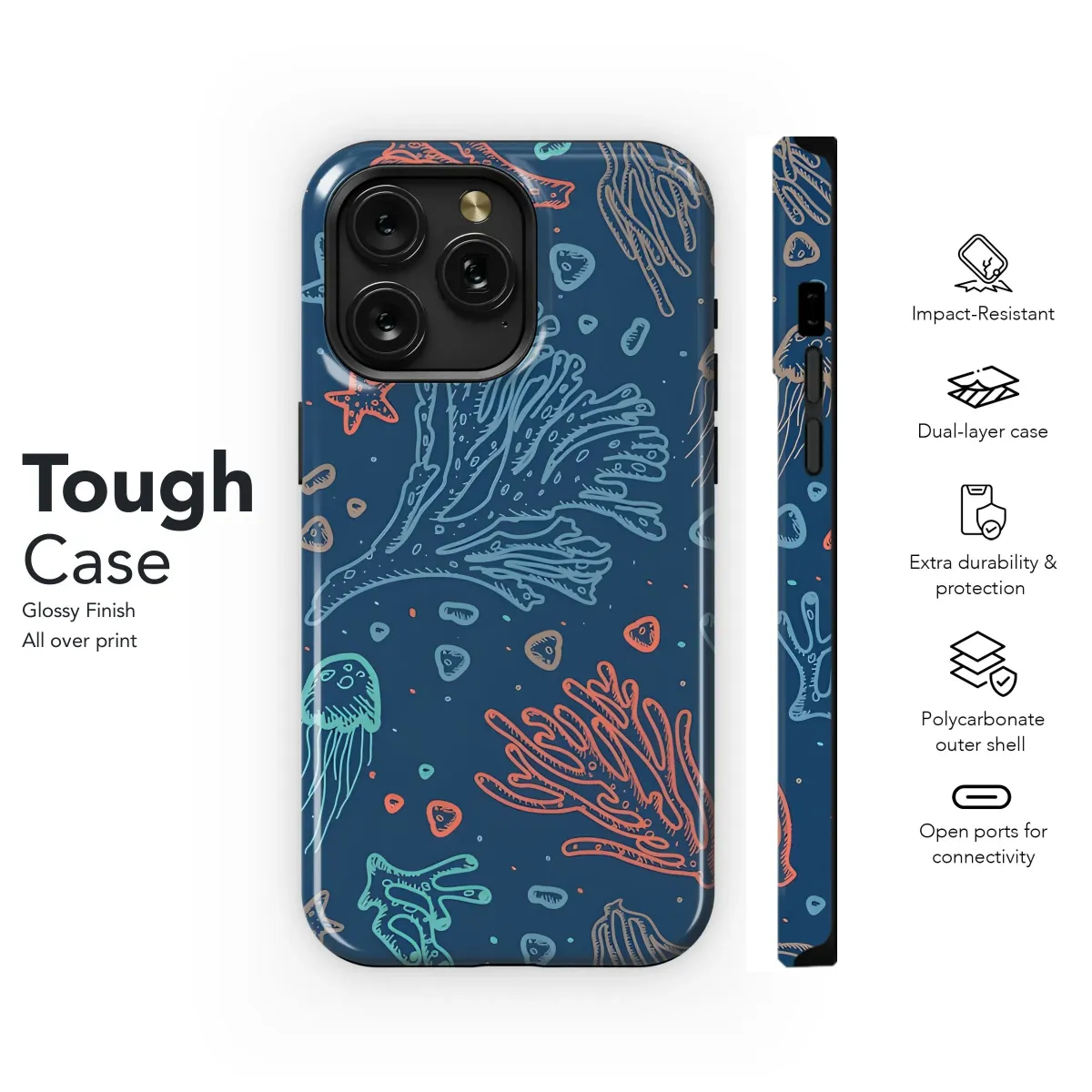 Dive into the enchanting depths with this stunning seamless pattern showcasing a vibrant underwater world. Hand-drawn elements depict intricate coral reef formations in warm hues, graceful jellyfish trailing delicate tentacles, and charming starfish scattered across the mysterious deep blue. The artistic sketch style brings a unique texture and organic feel to the design, capturing the diverse beauty of marine life. Accents of teal and warm orange pop against the rich background, creating a captivating visual tapestry. This design is perfect for adding a touch of ocean-inspired artistry and unique style to a personal accessory. Express your love for the sea and its fascinating creatures with this aesthetic print, transforming an everyday item into a statement piece. The detailed illustration and lively composition offer a constant reminder of the ocean's wonder, making it an ideal choice for anyone who appreciates nature-inspired art and a touch of nautical flair.