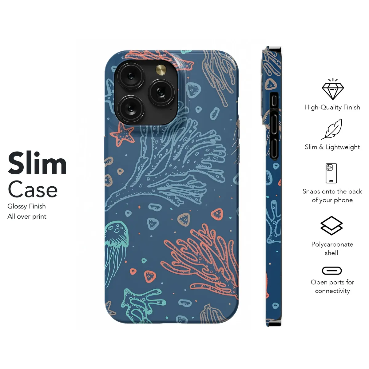 Dive into the enchanting depths with this stunning seamless pattern showcasing a vibrant underwater world. Hand-drawn elements depict intricate coral reef formations in warm hues, graceful jellyfish trailing delicate tentacles, and charming starfish scattered across the mysterious deep blue. The artistic sketch style brings a unique texture and organic feel to the design, capturing the diverse beauty of marine life. Accents of teal and warm orange pop against the rich background, creating a captivating visual tapestry. This design is perfect for adding a touch of ocean-inspired artistry and unique style to a personal accessory. Express your love for the sea and its fascinating creatures with this aesthetic print, transforming an everyday item into a statement piece. The detailed illustration and lively composition offer a constant reminder of the ocean's wonder, making it an ideal choice for anyone who appreciates nature-inspired art and a touch of nautical flair.