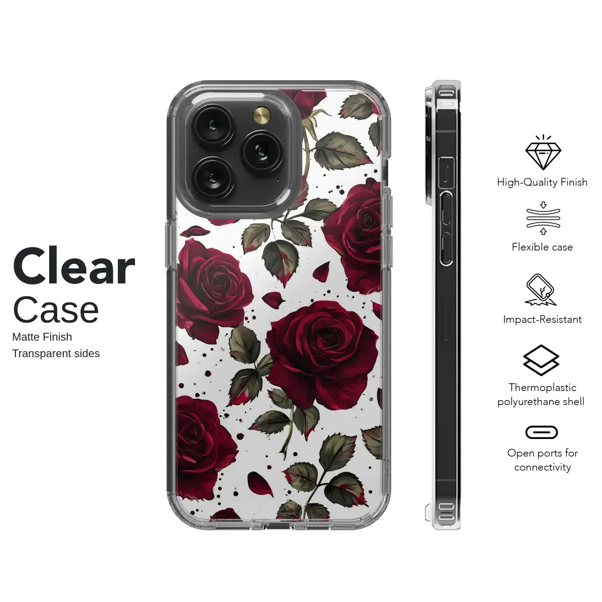 Embrace a blend of classic romance and modern edge with this stunning deep red rose design. Featuring a beautiful pattern of painterly red roses against a clean white backdrop, this design is elevated by artistic black ink splatters. The rich, dark floral aesthetic provides a sophisticated and bold look, perfect for anyone who appreciates unique botanical art.