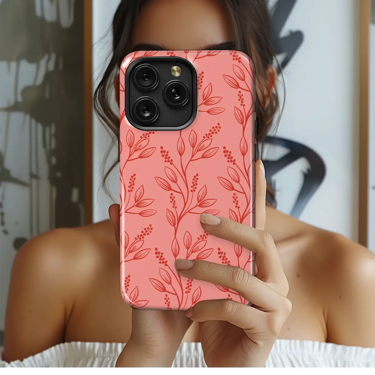 Wrap your most essential companion in the warmth of a sun-drenched secret garden with this enchanting coral botanical design. Delicate, hand-drawn vines in a vibrant, joyful poppy red dance across a soft peachy-pink canvas, creating a whimsical and continuous pattern of slender leaves and tiny berry clusters that feels both modern and timeless. This isn't just a pretty print; it's a daily dose of happiness, a perfect fusion of minimalist line art and a warm, inviting cottagecore aesthetic. Its simple, nature-inspired elegance adds an instant pop of cheerful color to your look, effortlessly blending with a boho or retro style and turning an everyday object into a statement of your personality. Imagine this lovely red and pink leaf pattern brightening your routine, a small piece of art that travels with you. It’s the perfect trendy tech accessory to elevate your own style, or a wonderfully thoughtful and cute gift for her—a best friend, sister, or any plant lover who cherishes unique, artistic details in their life. Let this beautiful design be a constant, happy reminder of nature's simple grace, a little piece of sunshine you can hold in your hand.