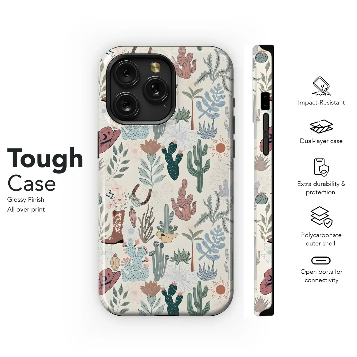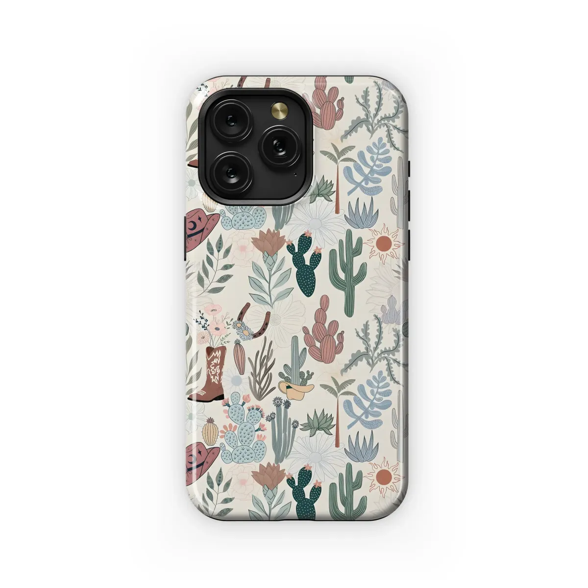 Embrace the desert's charm with this captivating design featuring a whimsical array of cacti, succulents, cowboy boots, and hats. This vibrant, hand-drawn pattern boasts a delightful blend of soft pastel hues and earthy tones, creating a unique and stylish aesthetic. The detailed illustrations of desert flora are balanced by the iconic Western motifs, resulting in a design that’s both trendy and timeless. Perfect for adding a touch of Southwestern flair to your personal style, this print is sure to turn heads. Its intricate details and harmonious color palette make it a versatile choice for expressing individuality. The high-quality print ensures vibrant colors and sharp details that will last, making it a durable and beautiful addition to your accessories. This design is a celebration of the beauty of the desert landscape and the spirit of the Wild West, offering a fun and fashionable statement piece. Show off your unique style with this eye-catching design, a perfect blend of nature's artistry and Western heritage. This print is a guaranteed conversation starter and a surefire way to express your personal flair.