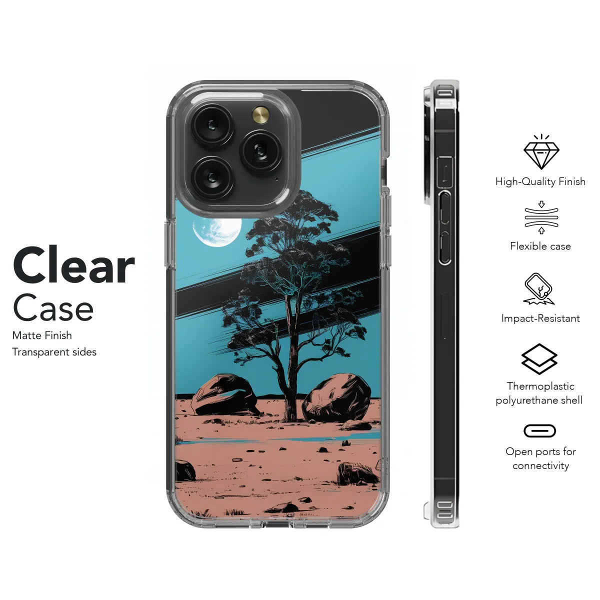 Indulge in the surreal beauty of the desert night with this captivating phone case. Featuring an ethereal tree silhouetted against a starlit sky, this case transports you to a world of serenity and mystery. The rich, earthy hues of the desert blend seamlessly with the glimmering stars, creating a captivating visual masterpiece. Protect your device in style with this unique and mesmerizing phone case.