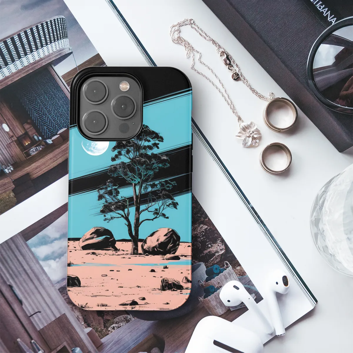 Indulge in the surreal beauty of the desert night with this captivating phone case. Featuring an ethereal tree silhouetted against a starlit sky, this case transports you to a world of serenity and mystery. The rich, earthy hues of the desert blend seamlessly with the glimmering stars, creating a captivating visual masterpiece. Protect your device in style with this unique and mesmerizing phone case.