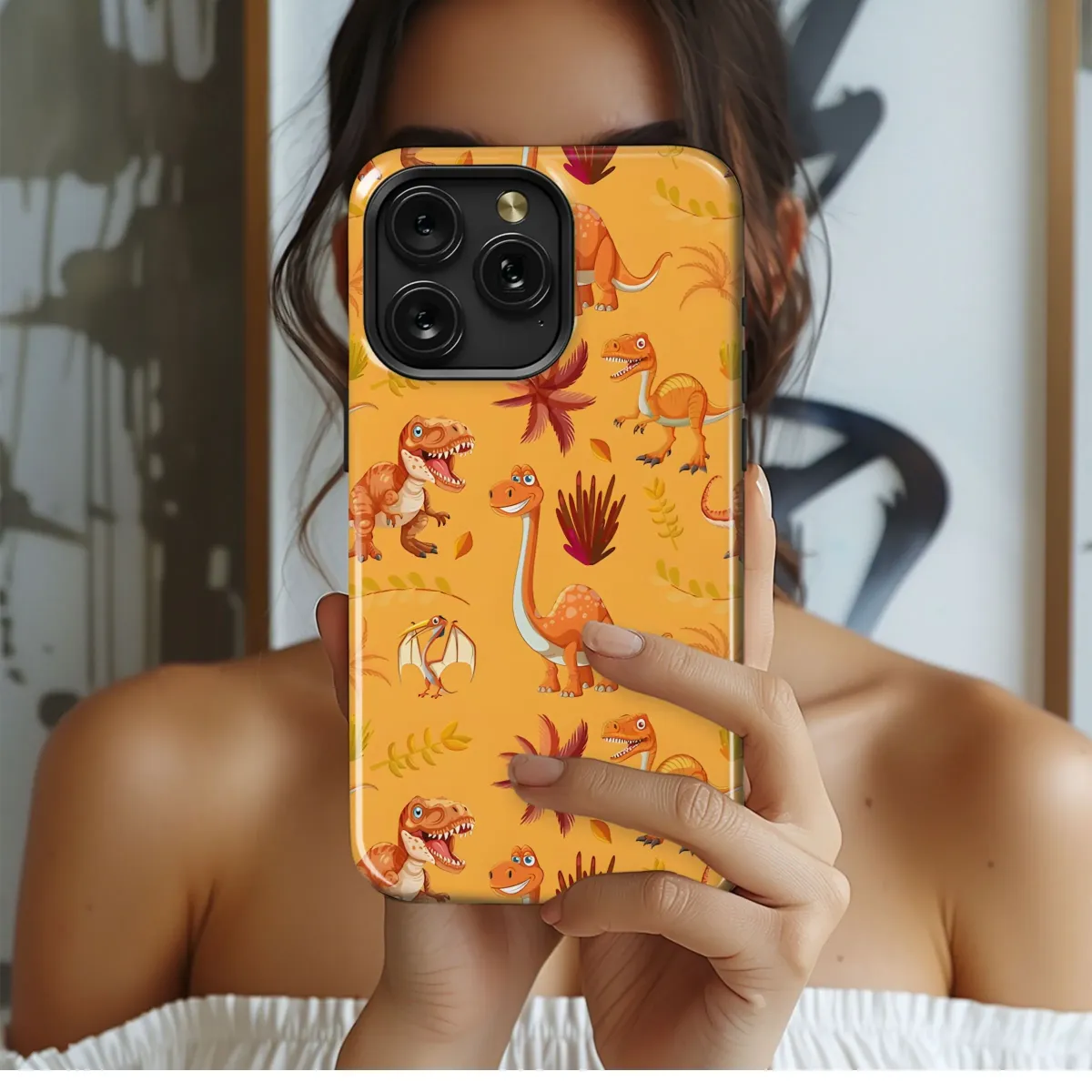 Roar into style with this delightful dinosaur pattern! Perfect for adding a touch of prehistoric fun to your everyday tech, this vibrant design features a playful mix of everyone's favorite dinos, from towering long-necks to fierce T-Rexes and soaring Pterodactyls. The cheerful orange and brown color palette is both eye-catching and versatile, making it a fantastic choice for kids and adults alike. This unique design brings a personalized and trendy look to your mobile device, adding a pop of color and personality to your tech accessories. Get ready to show off your love for these ancient giants with this adorable and on-trend jurassic motif. Great for gifts, treat yourself or a dino-loving friend with this fun and unique Dinosaur Print, Dino Art, Children's Design, Jurassic Pattern, Cute Animal Print, Personalized Tech, Trendy Design, Prehistoric Animals, Playful Illustration, Dino Lover Gift.