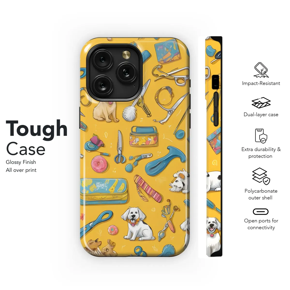 Show off your love for furry friends with this adorable pet grooming themed design! This vibrant and playful pattern features cute cartoon puppies, grooming tools like scissors and brushes, and colorful accessories all set against a cheerful yellow background. Perfect for dog lovers, groomers, and anyone who appreciates a touch of whimsy. This unique design makes a statement, ideal for expressing your passion for pets. Accessorize your everyday with this eye-catching, fun, and professionally created art. This premium quality aesthetic is sure to spark joy and conversation wherever you go. Grab yours today and flaunt your love for all things canine and grooming! Great for gift, celebration, or everyday use.