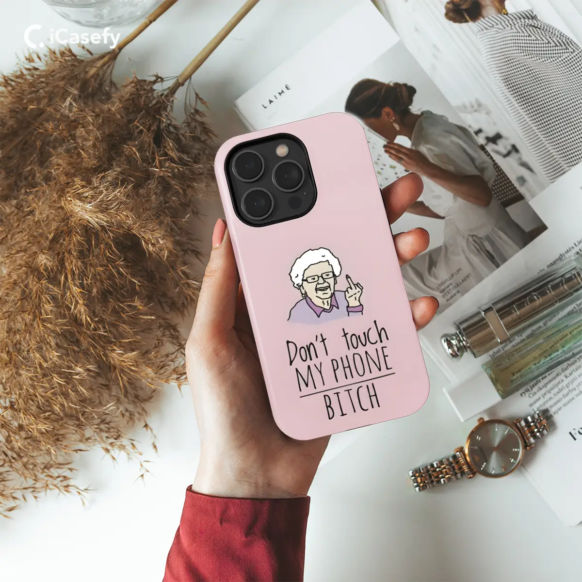 Protect your phone with sassy style! This "Don't touch my phone Bitch, Middle Finger Grandma" case features a bold and hilarious quote that will make everyone laugh. Made for iPhone, Samsung, Pixel, and more, it's the perfect way to keep your device safe while expressing your sassy personality. Say goodbye to phone snatchers with this unmissable case!