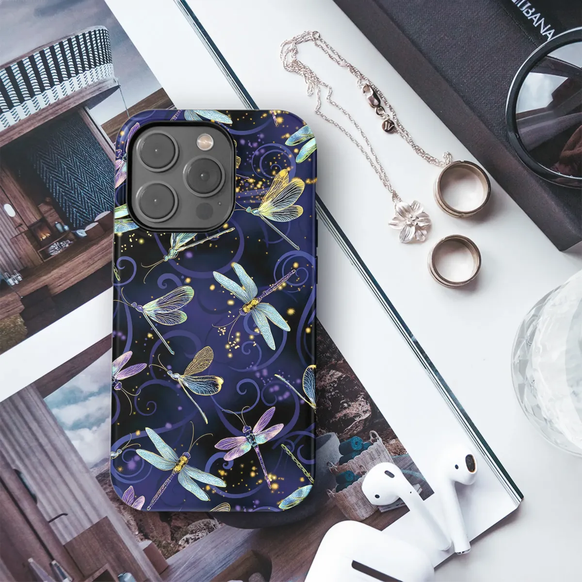 Adorn your device with this enchanting design featuring iridescent dragonflies dancing amidst a swirling nebula of gold. The intricate details of each dragonfly, rendered in shimmering metallic hues of purple, teal, and gold, create a captivating and mystical aesthetic. This vibrant print adds a touch of ethereal beauty and elegance, transforming your everyday accessory into a piece of wearable art. The deep navy background provides a rich contrast, making the dragonflies truly pop. This unique design is perfect for those who appreciate nature's intricate wonders and seek to express their individuality through subtle yet striking style. Its eye-catching pattern will spark conversation and admiration, setting your device apart from the ordinary. Experience the magic of nature's artistry with this breathtaking design, sure to turn heads wherever you go. This high-quality print ensures vibrant colors and lasting durability, maintaining its stunning appearance for years to come. Get yours today and let your style take flight!