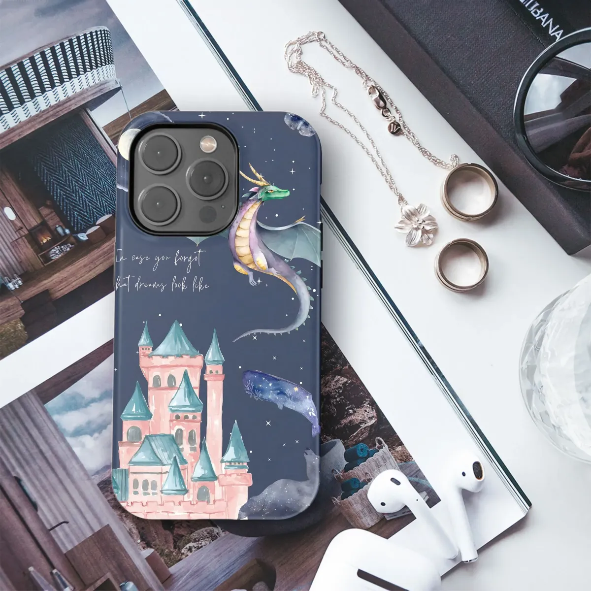 Carry a piece of enchantment with you with this whimsical design! Featuring a captivating watercolor scene of a majestic dragon soaring above a dreamy castle under a starlit sky, this artwork is perfect for anyone who loves fantasy, fairy tales, and a touch of magic. Let this "In case you forgot what dreams look like" artwork remind you to embrace your imagination and add a bit of wonder to your everyday. Ideal for dreamers, dragon lovers, and those seeking a unique artistic expression. This design incorporates elements of celestial art with a moon, stars and a wolf silhouette, also a whale with stars in the body, making it a beautiful conversation starter. Whether you're drawn to fantasy art, watercolor illustrations, or simply want to express your inner child, this enchanting piece is sure to bring a smile to your face. Grab yours now and carry a piece of magic wherever you go!