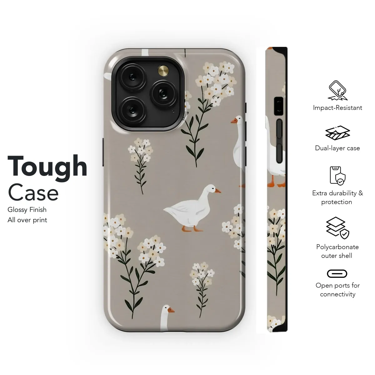 Ducks mingle with delicate blooms in this charming phone case. Available for iPhone, Samsung, and Pixel models. Protect your phone in style!