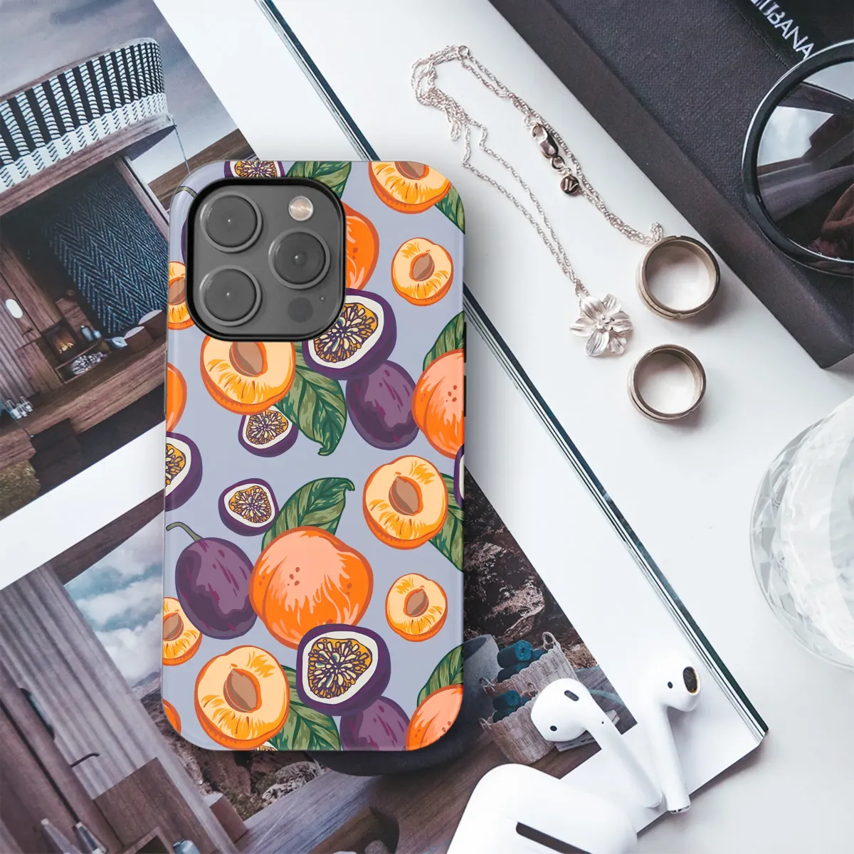 Wrap your most essential daily companion in the sweet, sun-drenched haze of a late summer picnic. This stunning orchard-inspired design is a feast for the eyes, capturing the delicious feeling of a perfect, golden afternoon. Vibrant, juicy peaches and blushing apricots burst with cheerful orange, their soft fuzz almost tangible, while deep, velvety plums offer a rich, moody contrast. Tucked amongst lush green leaves, exotic passion fruit reveals its intricate, star-like seeds, adding a touch of the tropics to this classic harvest scene. The entire bountiful illustration is set against a dreamy periwinkle blue, making the warm colors pop in a display of pure painterly joy. This isn't just a pattern; it's wearable art that brings a cottagecore aesthetic to your tech, a little slice of happiness you can carry everywhere. Perfect for lovers of botanical art, farmer's market vibes, and colorful accessories, this unique fruit pattern makes an unforgettable gift for her, a best friend, or anyone who wants to turn their everyday device into a statement of joyful, artistic style. Let this charming design bring the spirit of summer to your hands all year long.