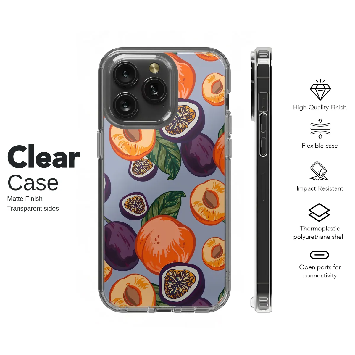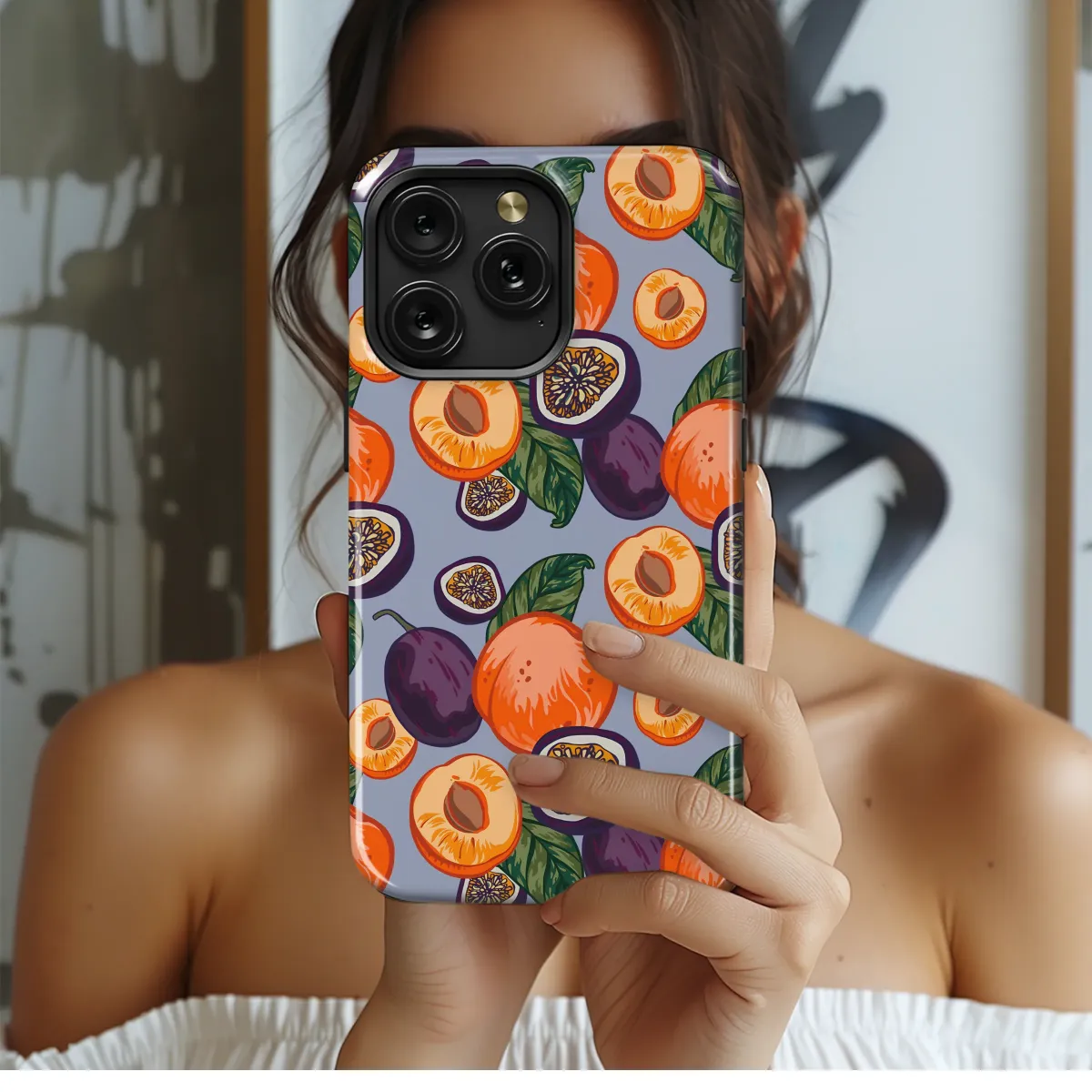 Wrap your most essential daily companion in the sweet, sun-drenched haze of a late summer picnic. This stunning orchard-inspired design is a feast for the eyes, capturing the delicious feeling of a perfect, golden afternoon. Vibrant, juicy peaches and blushing apricots burst with cheerful orange, their soft fuzz almost tangible, while deep, velvety plums offer a rich, moody contrast. Tucked amongst lush green leaves, exotic passion fruit reveals its intricate, star-like seeds, adding a touch of the tropics to this classic harvest scene. The entire bountiful illustration is set against a dreamy periwinkle blue, making the warm colors pop in a display of pure painterly joy. This isn't just a pattern; it's wearable art that brings a cottagecore aesthetic to your tech, a little slice of happiness you can carry everywhere. Perfect for lovers of botanical art, farmer's market vibes, and colorful accessories, this unique fruit pattern makes an unforgettable gift for her, a best friend, or anyone who wants to turn their everyday device into a statement of joyful, artistic style. Let this charming design bring the spirit of summer to your hands all year long.