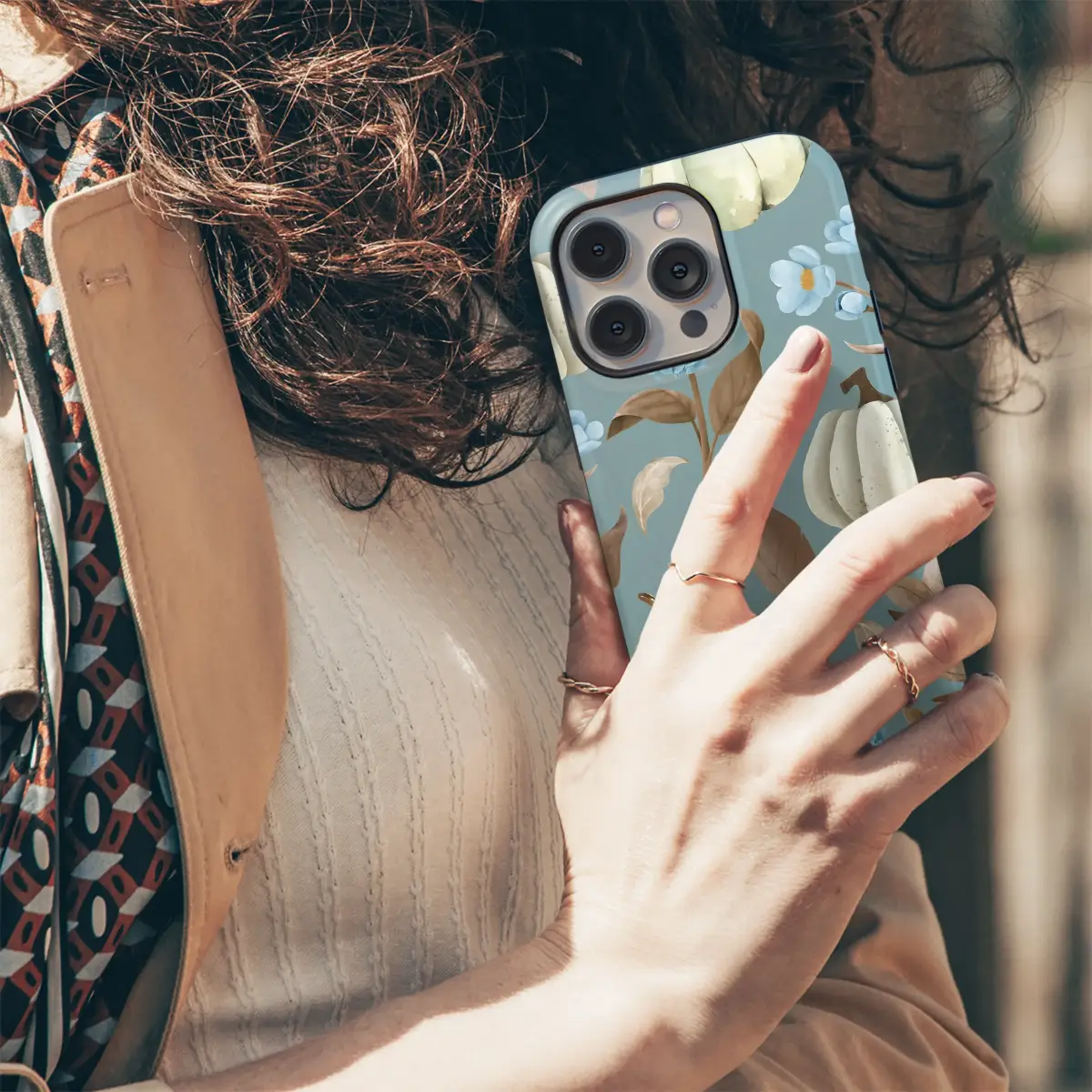 Step into a dreamlike autumn day where the crisp air whispers through a secret garden painted in unexpectedly serene hues. This enchanting watercolor design captures the quiet magic of the harvest season with a unique, artistic twist that feels both fresh and timeless. Imagine soft, creamy white pumpkins, plump and perfect, nestled amongst clusters of delicate, dusty blue hydrangeas and dainty wildflowers that seem to dance in a gentle breeze. The soft-wash watercolor textures bring each botanical element to life with an ethereal quality, from the charming gourds to the scattering of warm, earthy brown leaves, all floating upon a calming, muted blue-green background. This captivating pattern is more than just an illustration; it’s a feeling—a tangible piece of cozy cottagecore elegance for the modern romantic. Perfect for anyone who adores unique, nature-inspired art, this rustic yet sophisticated design celebrates the fall season in a subtle, beautiful way. Let this charming artwork adorn your most-used accessory, transforming it into a statement of personal style and a reminder of nature's tranquil beauty. It’s an ideal aesthetic gift for her, or a special treat for yourself to embrace the cozy spirit of the season with a touch of whimsical grace. Carry the magic of a blue autumn harvest wherever you go.