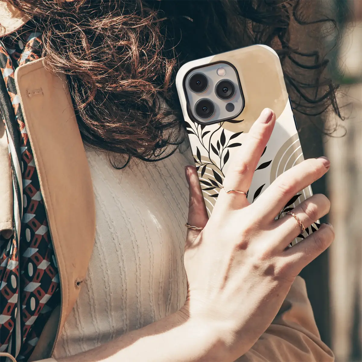 Embrace a moment of serene tranquility every time you reach for your most essential device with this stunning abstract botanical design. A delicate plant silhouette, rendered in bold, inky black, gracefully dances across a modern landscape of warm, earthy tones. A large, textured sun or moon hangs in a soft cream sky, casting a gentle, peaceful glow over minimalist rainbow arches that rise from below, grounding the design with clean, geometric harmony. This isn't just an accessory; it's a small, portable piece of art designed to accompany you on your daily journey. Perfect for the bohemian soul with a minimalist heart, this Japandi-inspired design transforms your tech into a statement of serene elegance and quiet confidence. The neutral color palette of sand, beige, and rich terracotta makes it a versatile and sophisticated gift for her, or for anyone who appreciates organic, nature-inspired aesthetics. Let this celestial botanical scene bring a touch of curated style to the palm of your hand, elevating your everyday with its uniquely calming and artistic beauty.