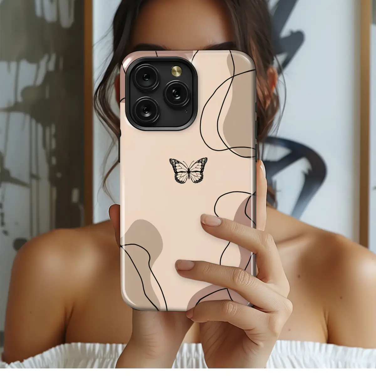Wrap your most-used daily companion in the quiet beauty of transformation with this stunning bohemian art piece. A delicate, minimalist butterfly, a timeless symbol of growth and freedom, takes center stage, its intricate wings rendered in classic black and white. It floats gracefully against a dreamy, abstract landscape of warm, neutral earth tones that feel both modern and comforting. Imagine soft, creamy beige, muted terracotta, and dusty rose swirling together like a gentle desert sunset, all tied together with elegant, free-flowing black line art that adds a touch of hand-drawn charm. This isn't just a stylish shield for your tech; it's a daily dose of nature-inspired serenity and a statement of your unique, artistic soul. Perfect for the lover of minimalist design, boho aesthetics, and the trendy Y2K revival, this design turns your essential accessory into a piece of wearable art. It’s a gentle, beautiful reminder to embrace change and find your own path, making it the perfect thoughtful gift for her, a best friend, or a special treat to elevate your own aesthetic. Carry a whisper of whimsy and calm wherever you go.
